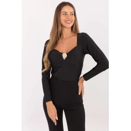 Elegantní blůza standardní délky vyrobená z převažující směsi viskózy a polyesteru, která spojuje pohodlí nošení s jemnou elegancí. Model se vyznačuje hladkým zpracováním a ženským výstřihem ve tvaru srdce, kolem kterého se nachází ozdobný kovový prvek a jemné rouchání, které celku dodává zvláštní charakter. Vsazené, zpevněné košíčky zajistí ideální přizpůsobení a podporu poprsí, díky čemuž se blůza prezentuje velmi elegantně bez dalších dílů spodního prádla. Dlouhé rukávy zdůrazňují formální styl a absenci zapínání dělá model pohodlným a praktickým. Skvělý návrh na slavnostní příležitosti, obchodní schůzky nebo elegantní výstupy.