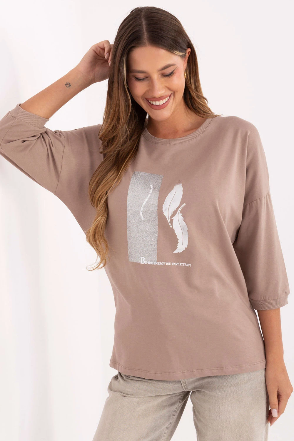 Klasická dámská tričko s metalickým potiskem vpředu je ideálním návrhem na každý den, který stylizaci dodává jemný lesk. Vyrobená z měkké bavlny s přídavkem elastanu poskytuje pohodlí a svobodu pohybu a standardní délka umožňuje snadné kombinování s oblíbenými kalhotami nebo sukní. Model s 3/4 rukávem a klasickým kulatým výstřihem spojuje pohodlí s módním akcentem, díky čemuž se skvěle hodí jak do každodenních, tak do trochu volnějších, příležitostných stylizací.