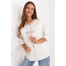 Volně střižená dámská blůza s vyšívaným motivem vpředu a šňůrkami u výstřihu je stylovým návrhem pro každodenní příležitosti. Vyrobená z měkké bavlny s přídavkem elastanu poskytuje pohodlí a volnost pohybu po celý den. Model s standardní délkou, s 3/4 rukávem a klasickým kulatým výstřihem spojuje jednoduchost s módním detail, díky čemuž se skvěle hodí do každodenního, ležérního stylu, ať už s kalhotami nebo sukni.