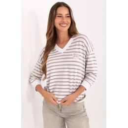 Casual dámský pruhovaný top s nášivkou vpředu je pohodlný a stylový návrh pro každodenní příležitosti. Vyrobený z měkkého micro modalu s přídavkem elastanu zajistí pohodlí a volnost pohybu po celý den. Model s standardní délkou, s 3/4 rukávem a výstřihem do V kombinuje klasický střih s moderním detailem v podobě nášivky, díky čemuž se skvěle hodí do každodenních outfitů, jak s kalhotami, tak s sukní.