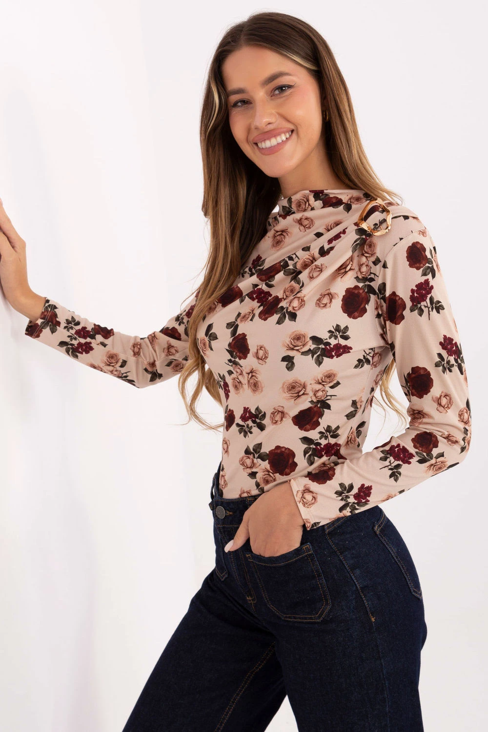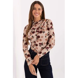 Elegantní dámská halenka s přizpůsobeným střihem je ideální volbou jak do práce, na setkání, tak i na každý den. Vyrobená z příjemné směsi viskózy a polyesteru spojuje pohodlí s odolností. Květinový vzor jí dodává ženský charakter, standardní délka a dlouhý rukáv ji dělají elegantní a nadčasovou. Tekutý výstřih se krásně skládá na postavě, a jemné záhyby na levém rameni, zdobené kovovým špendlíkem, jsou výjimečným akcentem, který zdůrazňuje elegantní styl halenky. Model bez zapínání zajišťuje pohodlí a volnost nošení.
