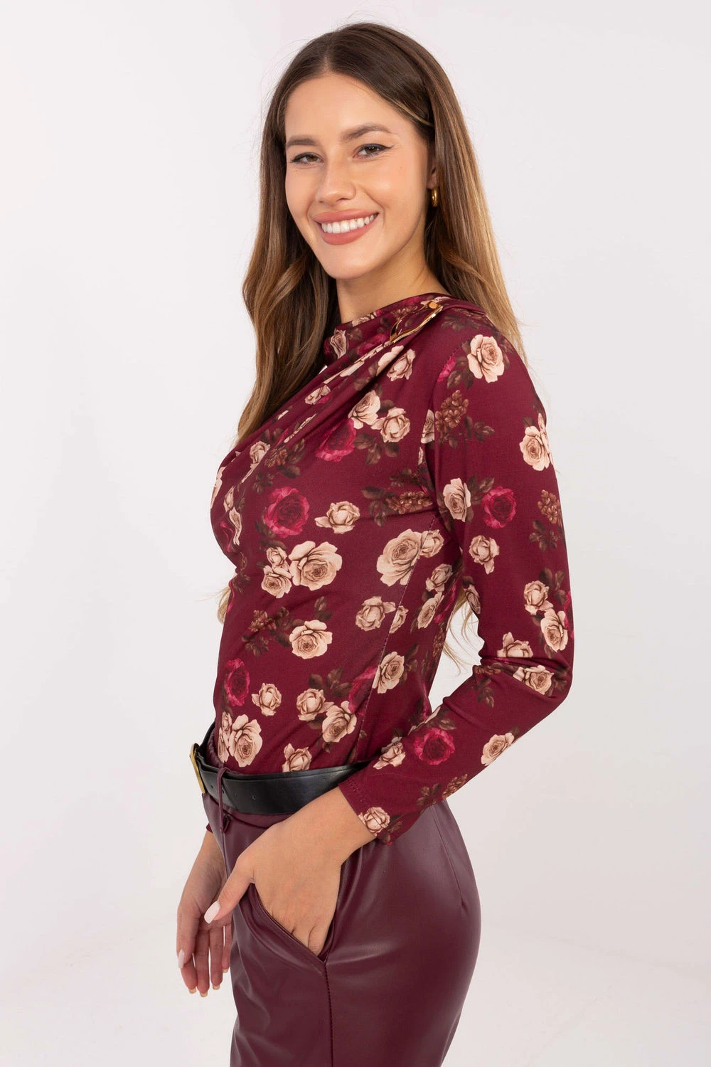Elegantní dámská košile s přizpůsobeným střihem je ideální volbou jak do práce, na schůzky, tak i na každodenní nošení. Vyrobená z příjemné směsi viskózy a polyesteru, spojuje pohodlí s odolností. Květinový vzor jí dodává ženský charakter, standardní délka a dlouhý rukáv dodávají šarm a nadčasovost. Živý výstřih se krásně přizpůsobuje postavě, jemné záhyby na levém rameni ozdobené kovovým špendlíkem jsou výjimečným akcentem, který zdůrazňuje elegantní styl košile. Model bez zapínání zaručuje pohodlí a volnost pohybu.