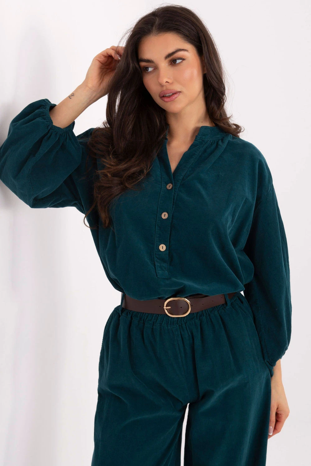 Elegantní košilová blůza v casualovém provedení, ideální na každý den. Vyrobená z lehkého a příjemného polyesteru, poskytuje pohodlí po celý den. Model má dlouhé nafouklé rukávy, které dodávají jemnou lehkost a ženský charakter. Výstřih ve tvaru srdce s jemným stojáčkem krásně zdůrazňuje krk, a zapínání na knoflíky do poloviny délky usnadňuje oblékání a dodává celku elegantní dokončení. Blůza v hladké, jednotné barvě o standardní délce skvěle ladí jak s džíny, tak s sukněmi, vytvářející každodenní, stylový vzhled.