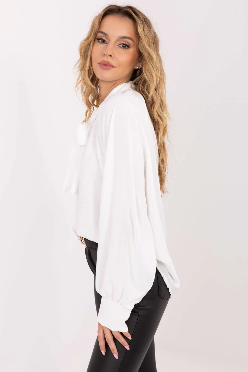 Elegantní dámská blůza standardní délky, vyrobena z vysoce kvalitní viskózy, která poskytuje pohodlí a krásně padne na postavu. Hladký materiál zdůrazňuje klasický, stylový charakter modelu, díky čemuž se blůza skvěle hodí na každodenní nošení, do práce, ale i na více slavnostní příležitosti. Model se vyznačuje dlouhým, lehce objemným rukávem, který dodává celku jemnou ženskost a efektní vzhled. Na výstřihu je elegantní šněrování, které umožňuje regulovat styl dokončení od uvolněnějšího po více upravený. Dalším ozdobným prvkem je stylový brož, zdůrazňující výjimečný charakter blůzy. Model nemá zapínání, co zvyšuje pohodlí a dodává mu plynulý, lehký tvar. Ideální volba pro ženy, které oceňují eleganci v každodenních a obchodních stylizacích.