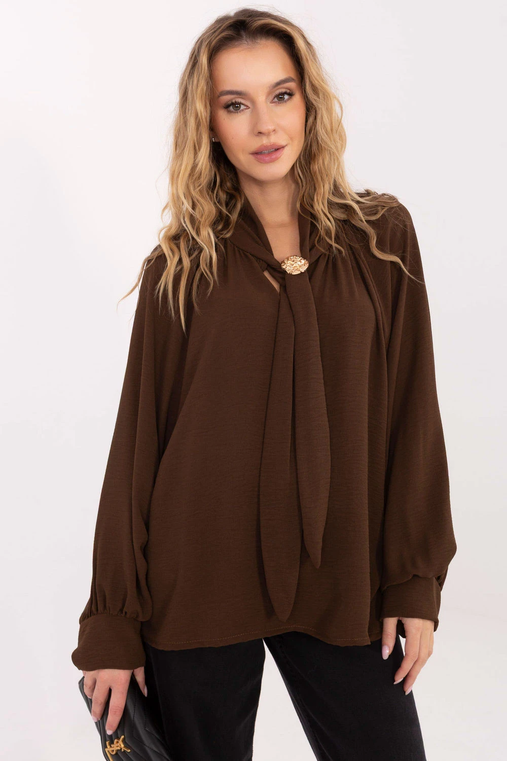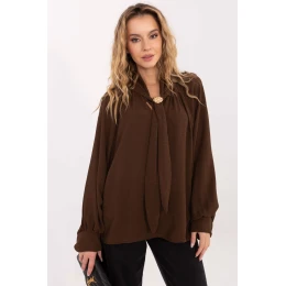 Elegantní dámská blůza standardní délky vyrobená z vysoké kvality viskózy, která poskytuje pohodlí a krásně padne na postavě. Hladký materiál zdůrazňuje klasický, elegantní charakter modelu, díky čemuž se blůza skvěle hodí na každodenní nošení, do práce, ale i na formální události. Model je zdoben dlouhým, lehce objemným rukávem, který dodává celku jemnou ženskost a efektní vzhled. Na výstřihu je elegantní šněrování, které umožňuje regulovat styl dokončení od volnějšího po více uklizený. Dalším ozdobným prvkem je stylový brož, který zdůrazňuje jedinečný charakter blůzy. Model nemá zapínání, co zvyšuje pohodlí a dodává mu plynulou, lehkou formu. Ideální volba pro ženy, které si cení elegance ve svých každodenních a pracovních outfitcích.