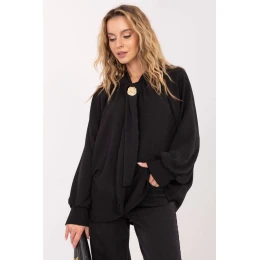 Elegantní dámská blůza standardní délky vyrobená z vysoce kvalitní viskózy, která zajišťuje pohodlí nošení a krásně padne na postavě. Hladký materiál zdůrazňuje klasický, elegantní charakter modelu, díky čemuž se blůza skvěle hodí na každodenní nošení, do práce, stejně jako na formální příležitosti. Model se vyznačuje dlouhým, lehce objemným rukávem, který dodává celku jemnou ženskost a efektní vzhled. Na výstřihu je elegantní šněrování, které umožňuje regulovat styl dokončení od volnějšího po více upravený. Dalším ozdobným prvkem je stylový brož, který zdůrazňuje výjimečný charakter blůzy. Model nemá zapínání, co zvyšuje pohodlí a dodává mu plynulou, lehkou formu. Ideální volba pro ženy, které si cení elegance v každodenním i pracovním stylu.