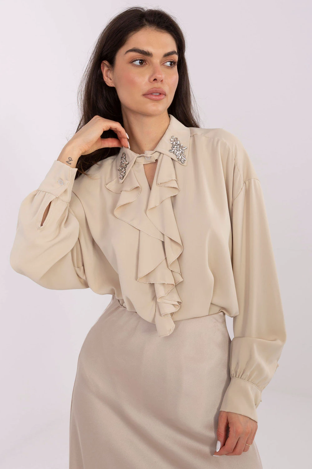 Jedinečná elegantní blůzka vytvořená s ohledem na návštěvní příležitosti, práci a večerní akce. Její hladký vzor dodává celku eleganci a jemnému šarmu, díky čemuž se skvěle hodí jak do formálních, tak i večerních stylizací. Model je vyroben z lehkého, příjemného polyesteru, který se krásně přizpůsobuje postavě. Dlouhá délka s charakteristickým zády delším než vpředu dává blůzce moderní a velmi ženský charakter. Blůzka okouzlí detaily, široký límec s ozdobami a jemný žabot zdůrazňují její elegantní styl. Vypouklé rukávy přidávají lehkosti a moderní, výrazné formy, vytvářejí efektní, ale stále velmi harmonický celek. Bez zapínání je blůzka pohodlná a snadno se obléká. Ideální model pro ženy, které si cení elegance, pohodlí a neokoukaných detailů ve svých každodenních i výjimečných stylizacích.