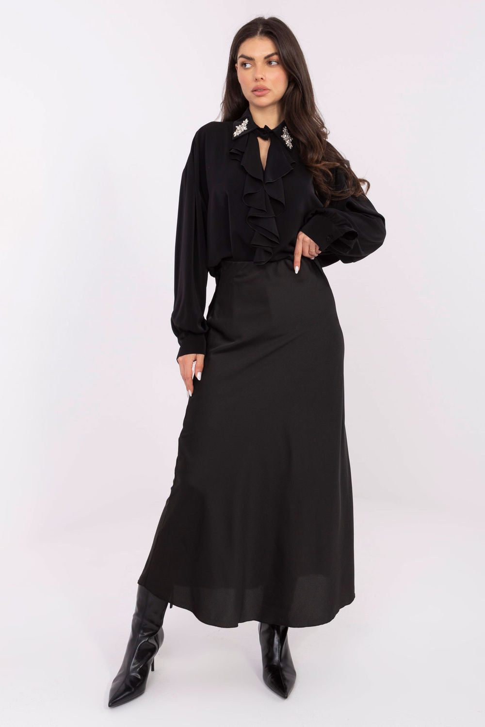 Výjimečná elegantní blůzka vytvořená s ohledem na návštěvní příležitosti, práci a večírky. Její hladký vzor dodává celku eleganci a jemnému šarmu, díky čemuž se skvěle hodí jak do formálních, tak i do večerních stylizací. Model je vyroben z lehkého, příjemného polyesteru, který se krásně tvaruje podle postavy. Dlouhá délka s charakteristickým zadním dílem delším než vpředu dodává blůzce moderní a velmi ženský charakter. Blůzka ohromuje detaily, široký límec s ozdobami a jemný žabot zdůrazňují její elegantní styl. Vypouklé rukávy přidávají lehkost a módní, výrazný tvar, vytvářejí efektní, ale stále velmi harmonický celek. Bez zapínání je blůzka pohodlná a snadno se obléká. Je to ideální model pro ženy, které si cení eleganci, pohodlí a neotřelé detaily ve svých každodenních i výjimečných stylizacích.