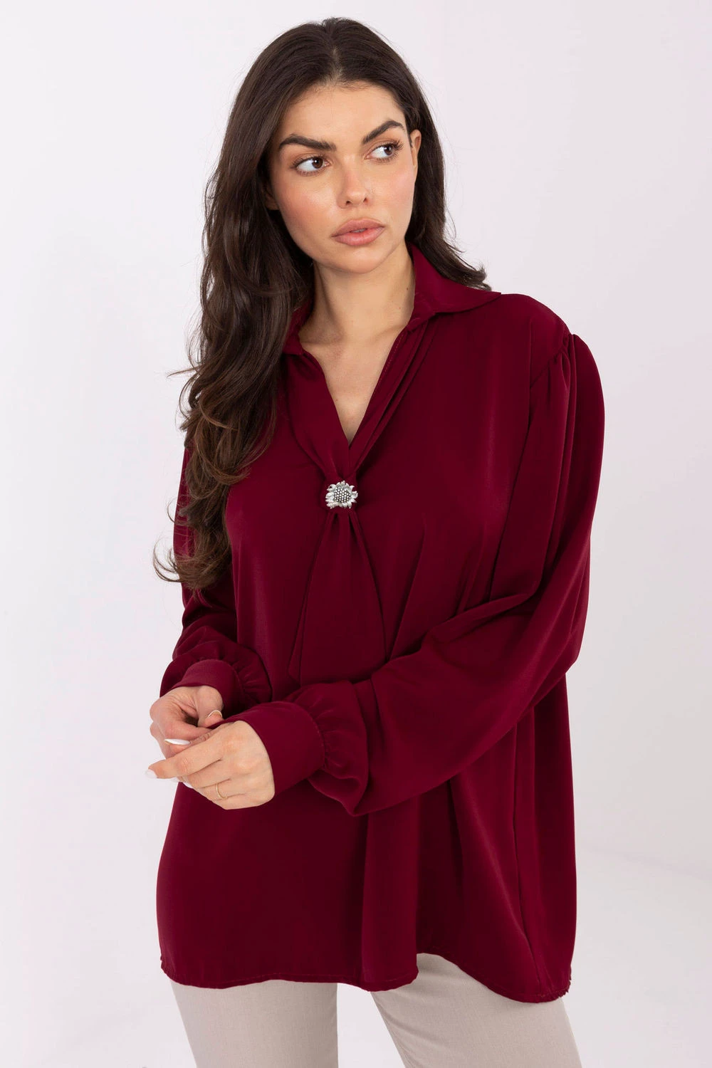 Elegantní stylová blůza je ideální volbou na každý den, do práce a na večerní události, kdy chcete vypadat elegantně a stylově. Její hladký vzor zdůrazňuje minimalistický, ale zároveň velmi ženský charakter, díky čemuž se skvěle hodí do mnoha stylizací, jak formálních, tak i volnějších. Model je vyroben z lehkého, příjemného polyesteru, který krásně padne na postavě. Prodloužený střih a dlouhý rukáv zajišťují, že blůza vypadá elegantně a poskytuje pohodlí po celý den. Výjimečným ozdobným prvkem je výstřih na srdíčko s vázáním, který umožňuje jemné upravení stylu od klasického po romantický. Celkový dojem dotváří odpínatelná brož, která přidává elegantní bižuterní akcent. Nafouklé rukávy přinášejí moderní a jemně výraznou linii, zatímco absenci zapínání zajišťuje pohodlí a jednoduchost při oblékání. Je to blůza, která snadno zdůrazní váš elegantní styl, bez ohledu na příležitost.