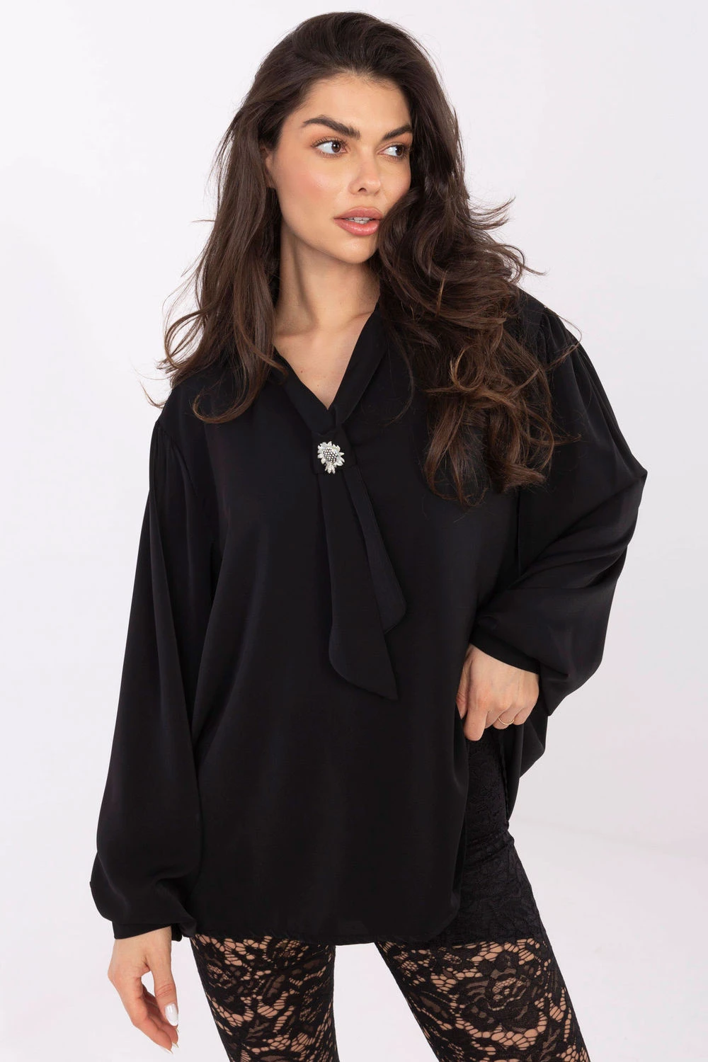 Elegantní stylová blůza je ideální volbou pro každodenní nošení, do práce a na slavnostní příležitosti, kdy chcete vypadat elegantně a s noblesou. Její hladký vzor zdůrazňuje minimalistický a zároveň velmi ženský charakter, díky čemuž se skvěle hodí do mnoha stylizací, jak formálních, tak volnějších. Model je vyroben z lehkého, příjemného na dotek polyesteru, který krásně padne na postavě. Prodloužený střih a dlouhý rukáv dělají blůzu elegantní a zajišťují pohodlí po celý den. Výjimečným ozdobným prvkem je výstřih do V s mašlí, který umožňuje jemné nastavení stylu, od více klasického po romantický. Celé doplňuje odnímatelná brož, přidávající elegantní bižuterní akcent. Pufíkové rukávy zavádějí módní, jemně výraznou linii a absence zapínání zajišťuje pohodlí a jednoduchost oblékání. Je to blůza, která s lehkostí podtrhne váš elegantní styl, bez ohledu na příležitost.