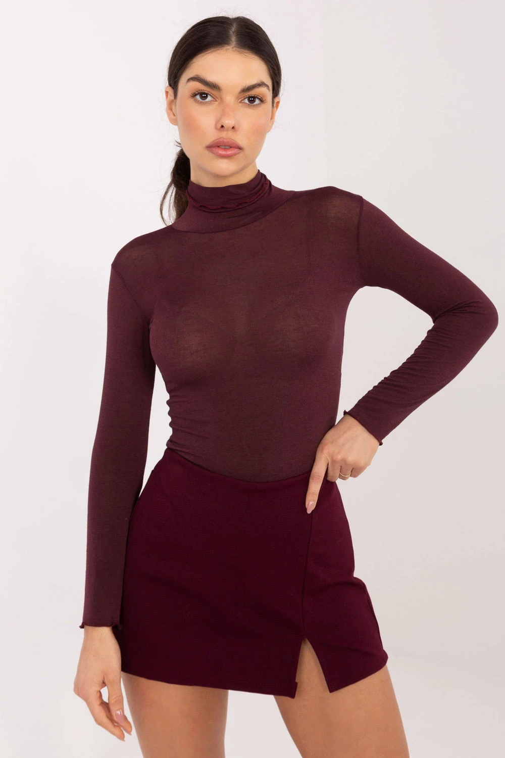 Elegantní, tenká blůza typu longsleeve s přiléhavým střihem, ideální pro každodenní outfit, zejména pokud jde o pohodlí a jemnou eleganci. Vyrobena z vysoce kvalitní směsi viskózy, elastanu, kašmíru a nylonu, je mimořádně měkká, příjemná na dotek a elastická, díky čemuž skvěle padne na postavu. Model v hladkém vzoru má standardní délku a dlouhý rukáv, což z ní činí skvělou základnu pro sako, kardigan nebo elegantní vestu. Tenký golfový límec dodává celku eleganci, zároveň nezatěžuje outfit. Blůza nemá zapínání, díky čemuž je pohodlná při oblékání a skvěle se přizpůsobuje tělu. Jedná se o nadčasový kousek šatníku, který spojuje pohodlí, jednoduchost a eleganci.