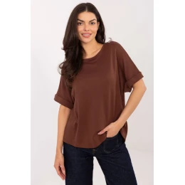 Dámský každodenní top vyrobený z měkkého materiálu typu viskóza je nabídkou spojující pohodlí a decentní eleganci. Materiál, který kombinuje bavlnu a modal, je jemný, mimořádně příjemný na dotek a poskytuje pohodlí po celý den. Model s standardní délkou, s krátkými rukávy a klasickým kulatým výstřihem, se obléká přes hlavu, což podtrhuje jeho volný, ležérní charakter. Hladký vzor činí top univerzálním a snadno kombinovatelným s různými kousky oblečení, od džínů po sukně nebo šortky.