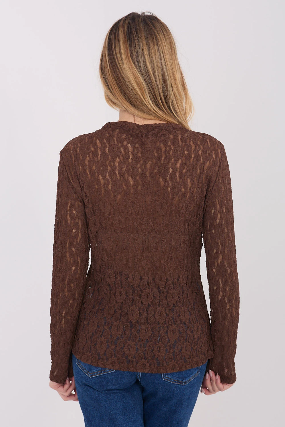 Elegantní krajková dámská blůza je stylovým návrhem, který se skvěle hodí do práce, stejně jako na formální a společenské události. Subtilní design a klasický tvar dělají z blůzy univerzální kousek ženského šatníku. Model standardní délky je vyroben z vysoce kvalitní kombinace viskózy a elastanu, co zajišťuje pohodlí nošení, pružnost a ideální přizpůsobení se postavě. Různorodá textura materiálu zdůrazňuje elegantní charakter blůzy a dodává jí jedinečný vzhled. Blůza má dlouhé rukávy a stylový dekolt typu loďka, který jemně zdůrazňuje ramena a krk. Model bez zapínání, nasazovaný přes hlavu, zaručuje pohodlí a estetické dokončení. Je to ideální volba pro ženy, které si cení eleganci, ženskost a nadčasový styl v každé situaci.