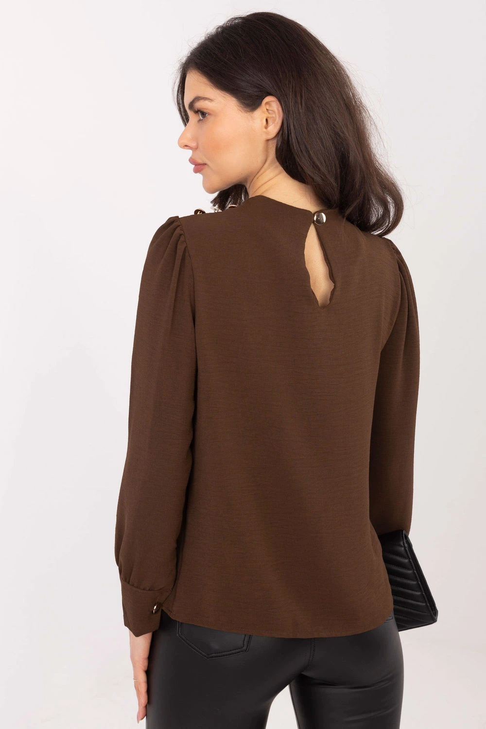 Elegantní blůza s jemným ženským stylem, ideální na slavnostní příležitosti i do práce. Vyrobená z hladké látky z polyesteru a elastanu, která poskytuje pohodlí a jemně se přizpůsobuje postavě. Blůza má kulatý výstřih a její ozdobou jsou efektní dlouhé rukávy, které přidávají eleganci. Balónovité rukávy s ozdobnými záhyby na ramenou a jemnými knoflíčky dodávají celku výjimečný charakter. Standardní délka dělá z blůzy skvělý doplněk jak ke sukním, tak ke kalhotám, vytvářející elegantní stylizace.