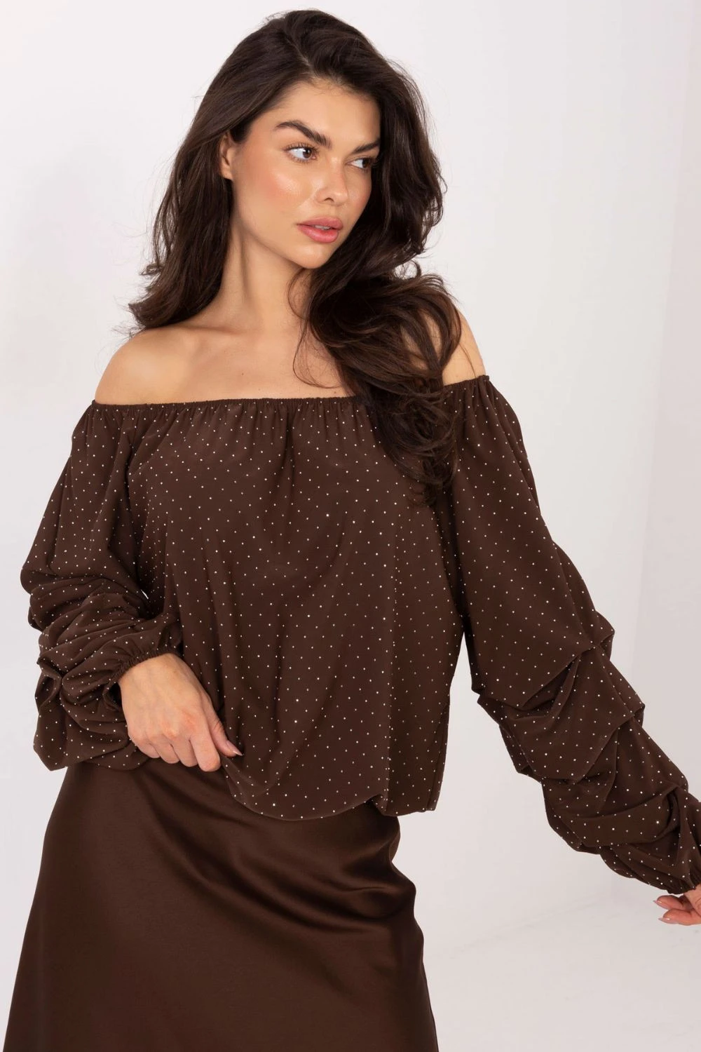 Elegantní dámská halenka je efektní volbou na společenské události a večírky. Vyrobená z vysoce kvalitní viskózy, je lehká, příjemná na dotek a poskytuje pohodlí po celý večer. Celá plocha materiálu je zdobena decentní aplikací z jete, která blůze dodává lesk a výrazný charakter. Model standardní délky s dlouhými rukávy má jemné záhyby na rukávech, které přinášejí elegantní lehkost a jemnost detailu. Dekolt ve stylu španělky decentně zdůrazňuje ramena a absenci zapínání dělá blůzu pohodlnou a snadnou na oblékání, ideální k elegantní sukní nebo kalhotám.