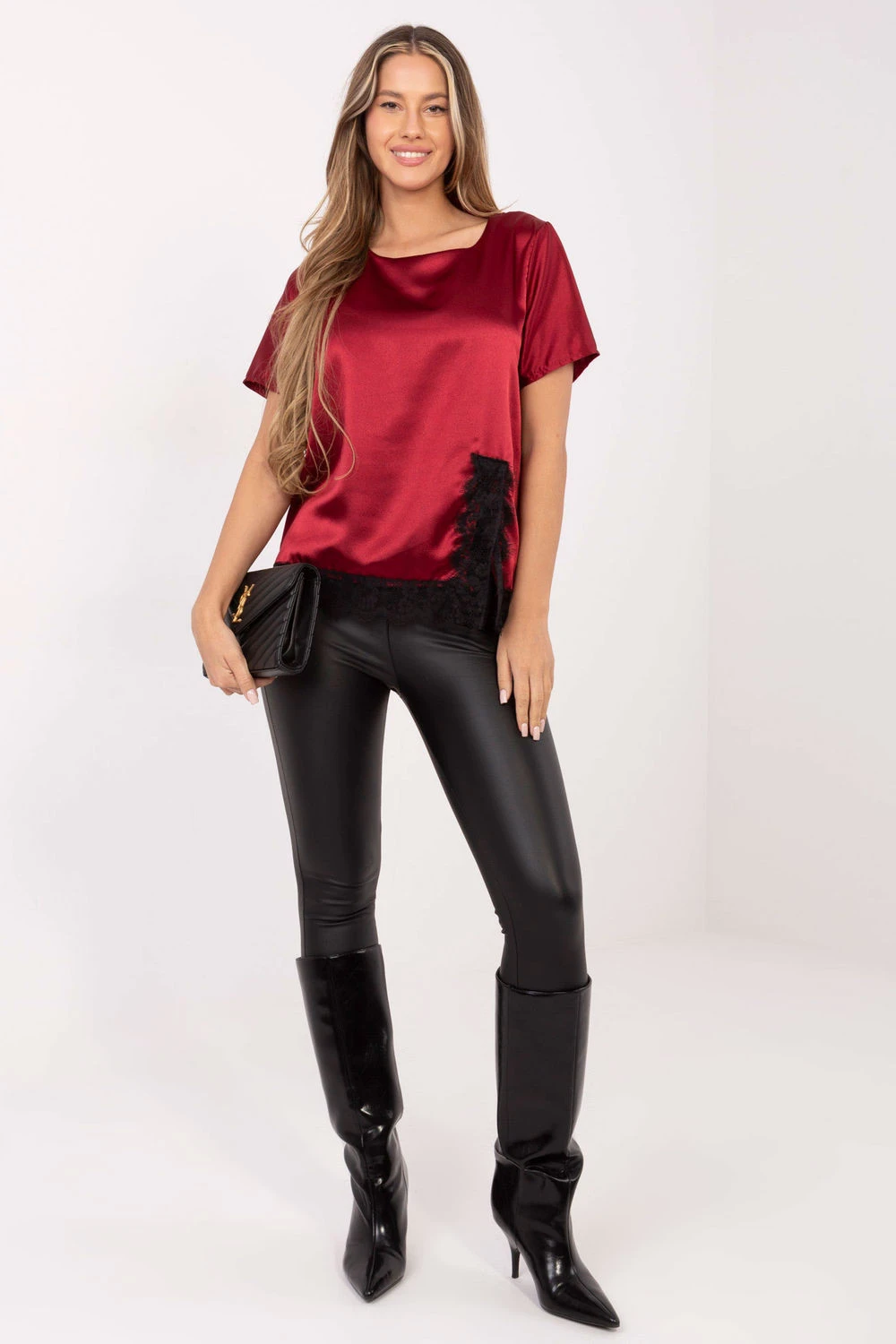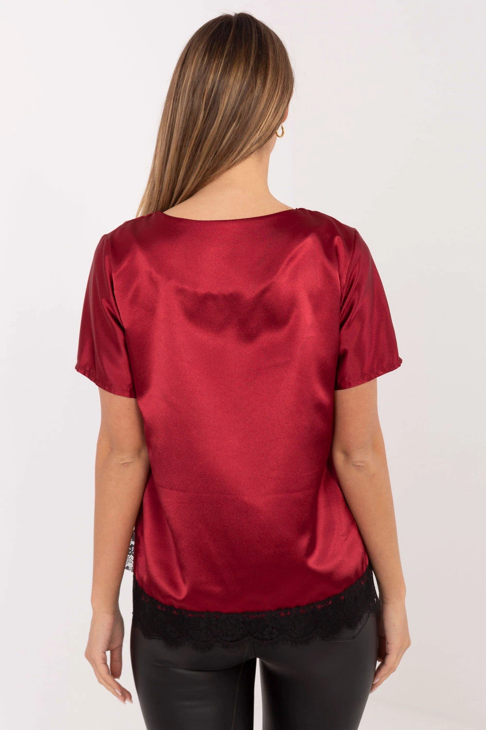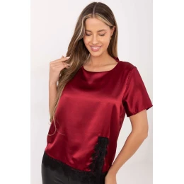 Elegantní a ženský top s elegantním charakterem, skvělý jak do každodenního nošení, tak do práce nebo na setkání. Vyrobený z vysoce kvalitní směsi polyesteru a elastanu, je příjemný na dotek, elastický a pohodlný na nošení. Model má standardní délku s krátkým rukávem a kulatým výstřihem, který jemně zdůrazňuje krk. Hladký materiál jí dodává univerzálnost, zatímco krajkové zakončení dole dodává celku jemnosti a elegantního akcentu. Ideální volba pro ženy, které oceňují klasický styl s ženským šarmem.
