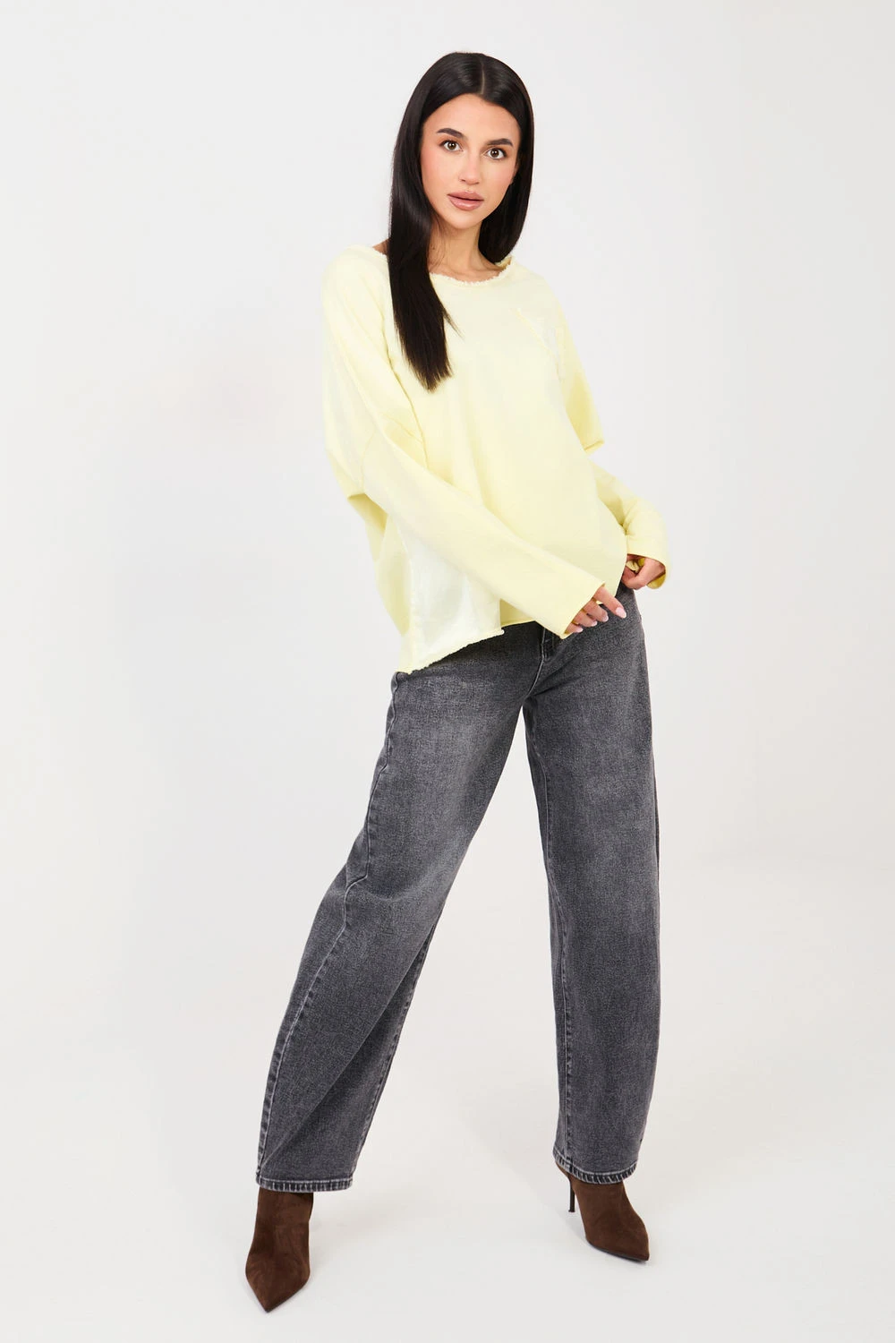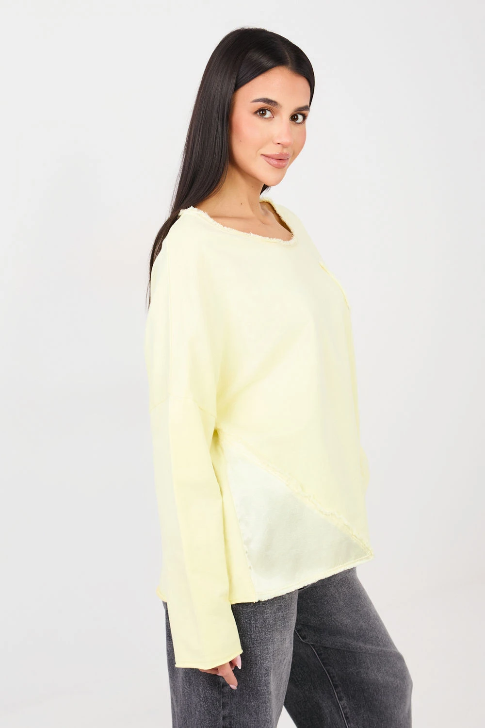 Volně střižený top s každodenním charakterem, kombinující pohodlí s decentními ozdobnými detaily. Vyroben z měkké bavlny s přídavkem elastanu, poskytuje pohodlí při nošení a lehké přizpůsobení postavě. Model s hladkým vzorem má klasický kulatý výstřih a dlouhé rukávy, ideální pro každodenní outfit. Ozdobný trhací materiál kolem výstřihu, na kapse a po pravé straně dodává topu charakter a originalitu. Standardní délka umožňuje skvěle sladit top jak s džíny, tak s sukněmi. Navíc praktická kapsa v oblasti hrudníku zdůrazňuje volný styl a funkčnost modelu.