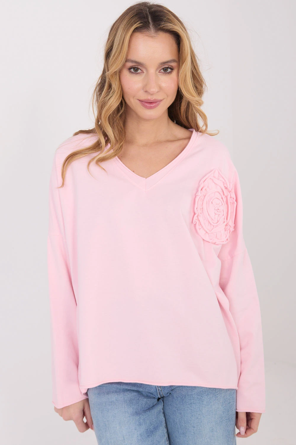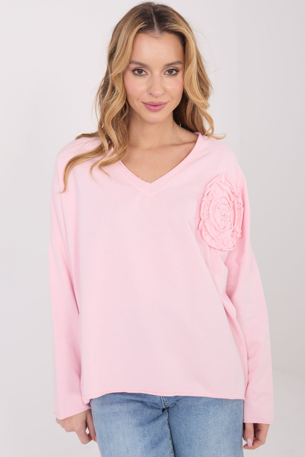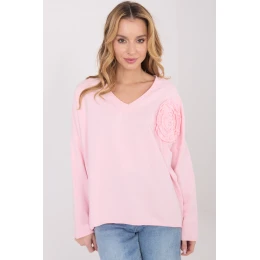 Každodenní volná blůza, kombinující pohodlí s jemným ženským detail. Vyrobená z měkké bavlny s přídavkem elastanu, poskytuje pohodlí a lehce přiléhavý střih. Model standardní délky má dlouhý rukáv a výstřih do V, který jemně zdůrazňuje krk. Hlavní ozdobou je aplikace ve formě přišitého květu, dodávající blůze jemný, stylový akcent. Ideální volba na každodenní, volné styly, které kombinují pohodlí s ženskou elegancí.