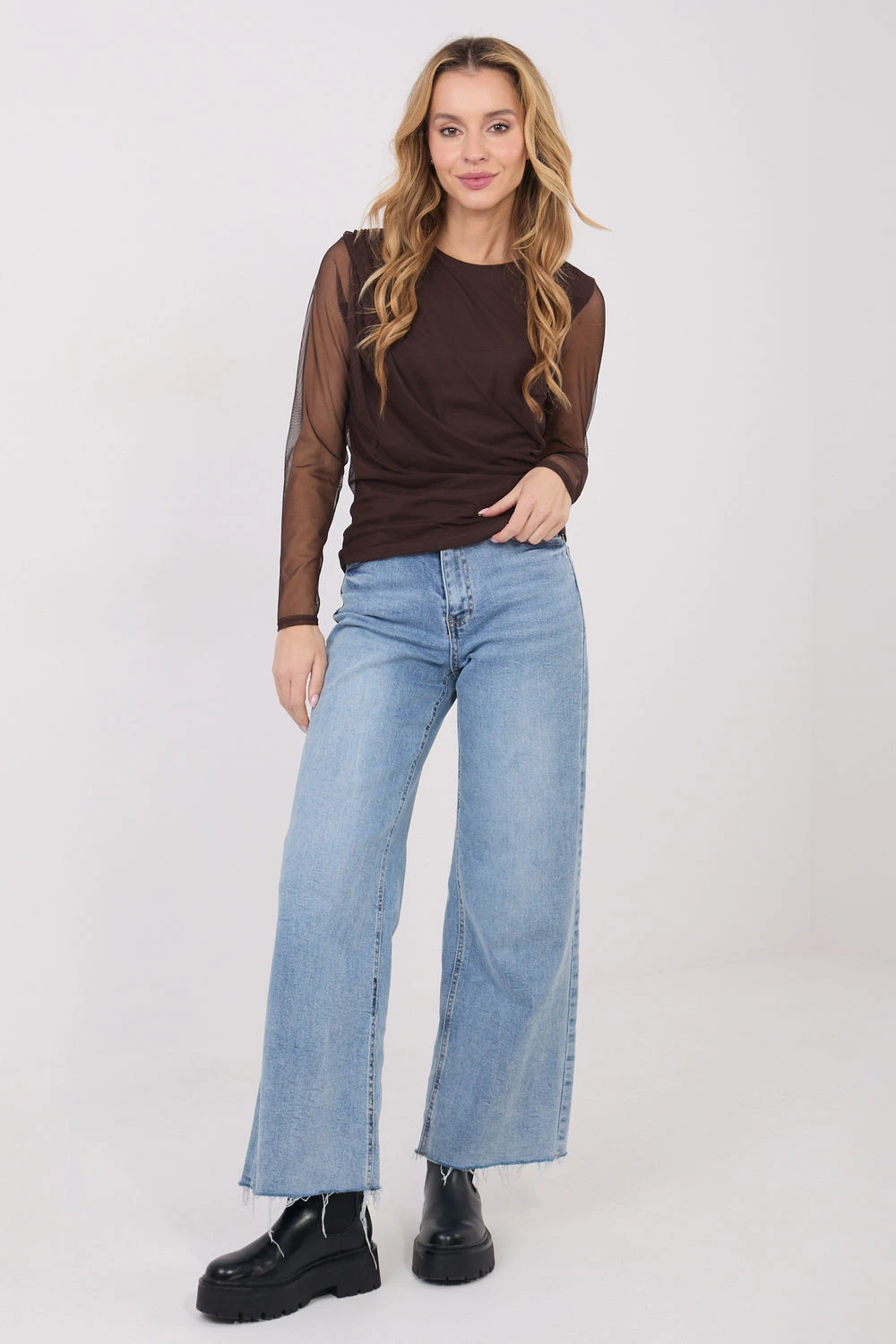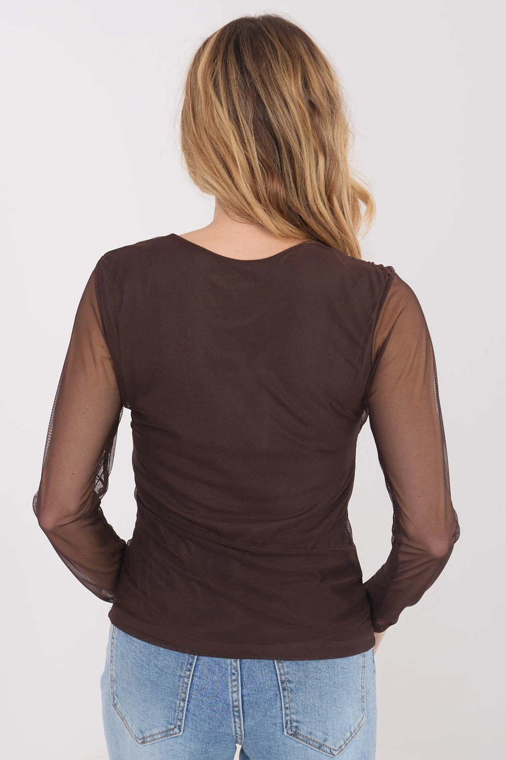 Elegantní blůza z jemné síťoviny s přiléhavým střihem, která jemně zdůrazňuje postavu a dodává outfitu rafinovaný charakter. Vyrobená z kombinace polyesteru a elastanu, poskytuje pohodlí nošení a elasticitu materiálu. Model s hladkým vzorem má klasický, kulatý výstřih a dlouhé rukávy, které zůstávají bez podšívky, vytvářejí lehký a smyslný efekt. Blůza má podšívku na těle, což zaručuje pohodlí a estetické dokončení. Ozdobné rouchy přidávají celku eleganci a jemně modelují postavu. Standardní délka zajišťuje, že se blůza skvěle hodí jak do pracovních, společenských stylizací, tak i na elegantní výstupy nebo akce.