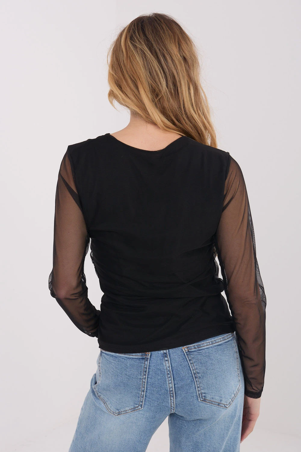 Elegantní halenka z jemné síťoviny s přiléhavým střihem, který jemně zdůrazňuje siluetu a dodává stylizaci rafinovaný charakter. Vyrobená z kombinace polyesteru a elastanu poskytuje pohodlí nošení a pružnost materiálu. Model s hladkým vzorem má klasický kulatý výstřih a dlouhé rukávy, které zůstávají bez podšívky, vytvářejí lehký a smyslný efekt. Halenka má podšívku na těle, což zaručuje pohodlí a estetické dokončení. Ozdobné záhyby přidávají eleganci a jemně modelují siluetu. Standardní délka zajišťuje, že se halenka skvěle hodí jak do pracovních, společenských, tak i na elegantní výlety nebo večírky.