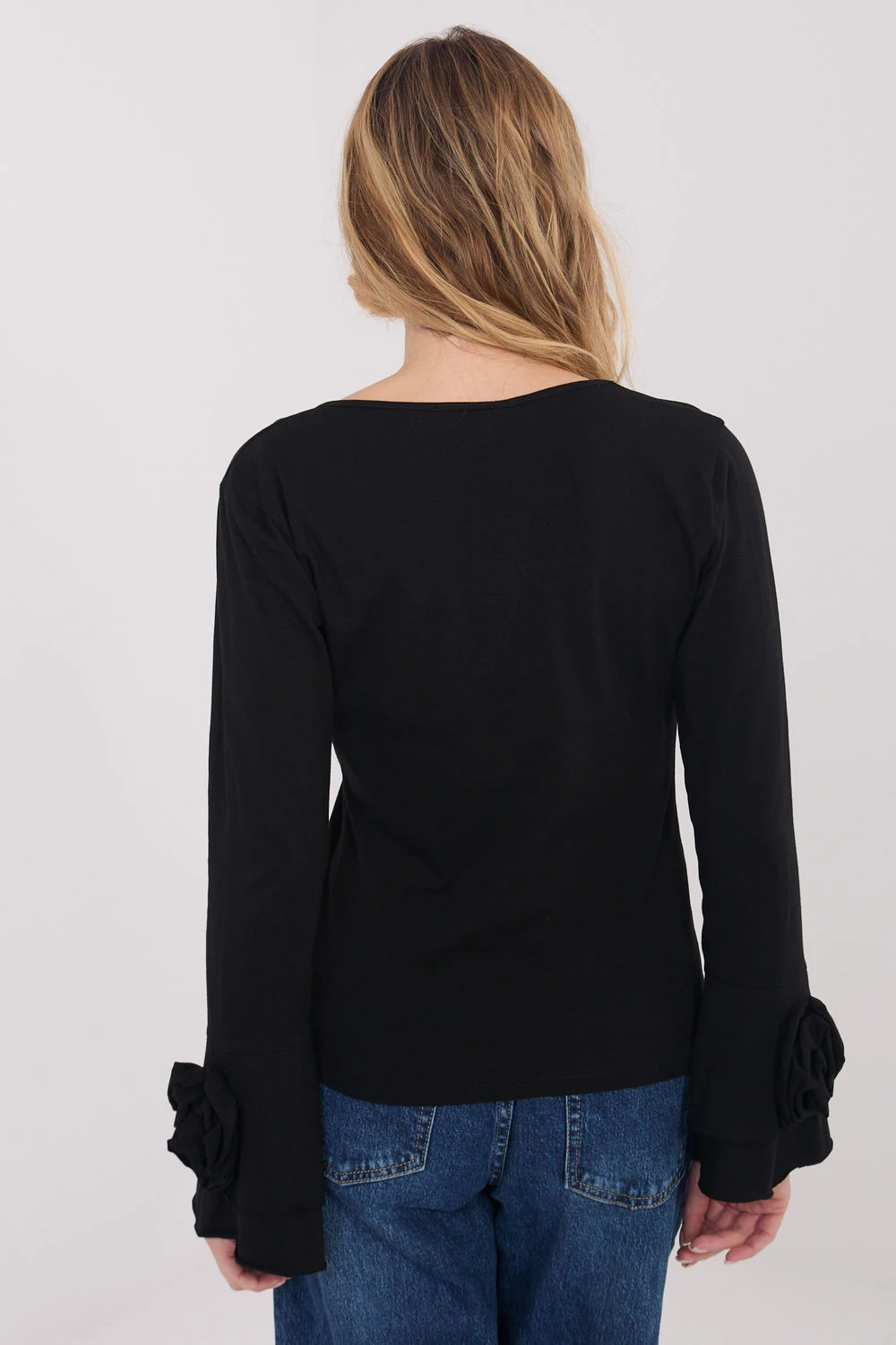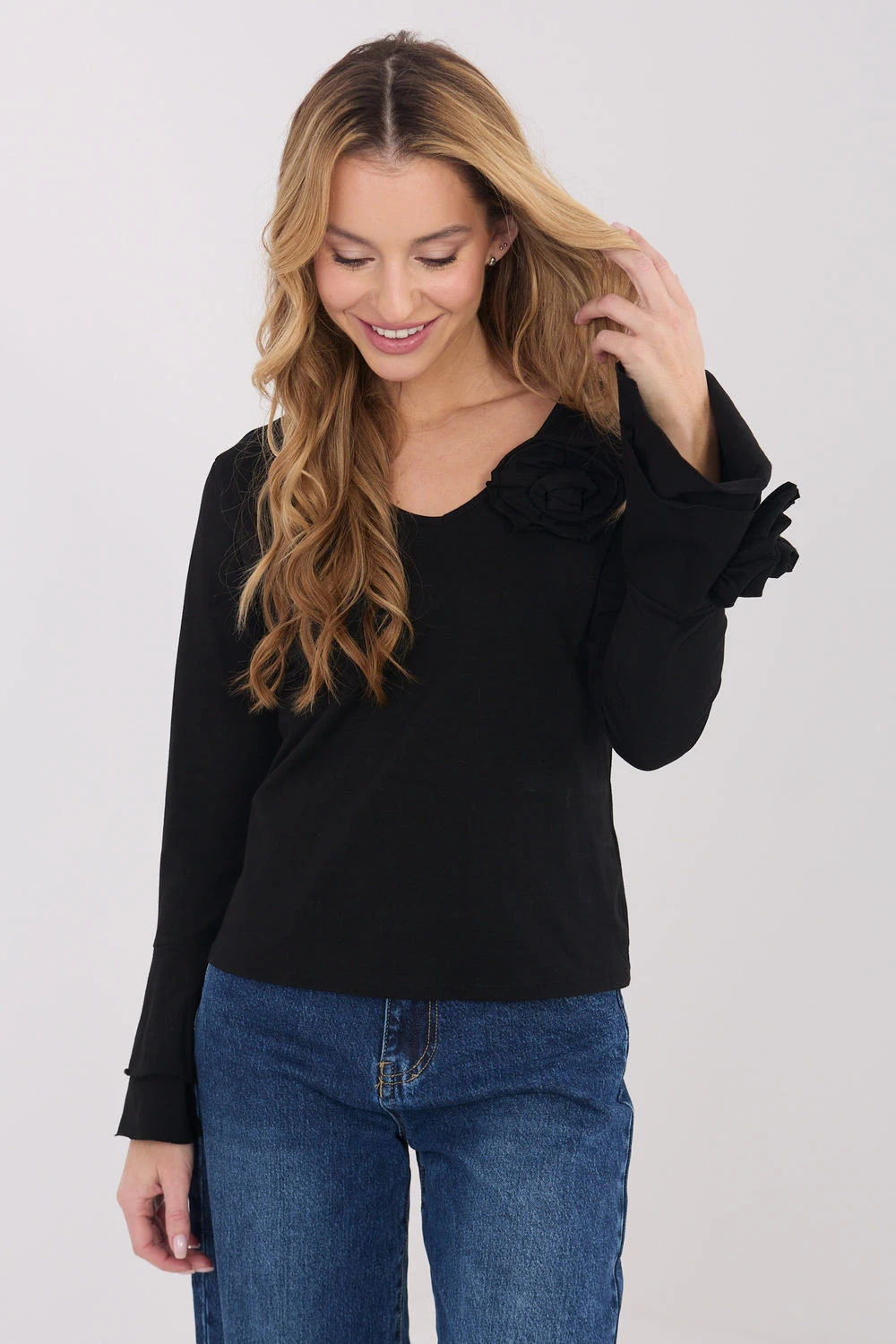 Elegantní blůza typu longsleeve s přiléhavým střihem, která efektně zdůrazňuje postavu a kombinuje klasiku s ozdobnými detaily. Vyrobená z vysoce kvalitní bavlny, poskytuje pohodlí při nošení a příjemné přiléhání po celý den. Model s hladkým vzorem má vykrojení do V, které jemně zdůrazňuje krk a dodává ženský charakter. Dlouhé zvonové rukávy dodávají celkové lehkosti a elegance, a ozdobné látkové květy umístěné na rukávech a kolem vykrojení představují výjimečný dekorační prvek. Standardní délka umožňuje, aby se blůza skvěle hodila jak do každodenních stylizací, do práce, na schůzky, tak i na elegantní výstupy nebo večírky.