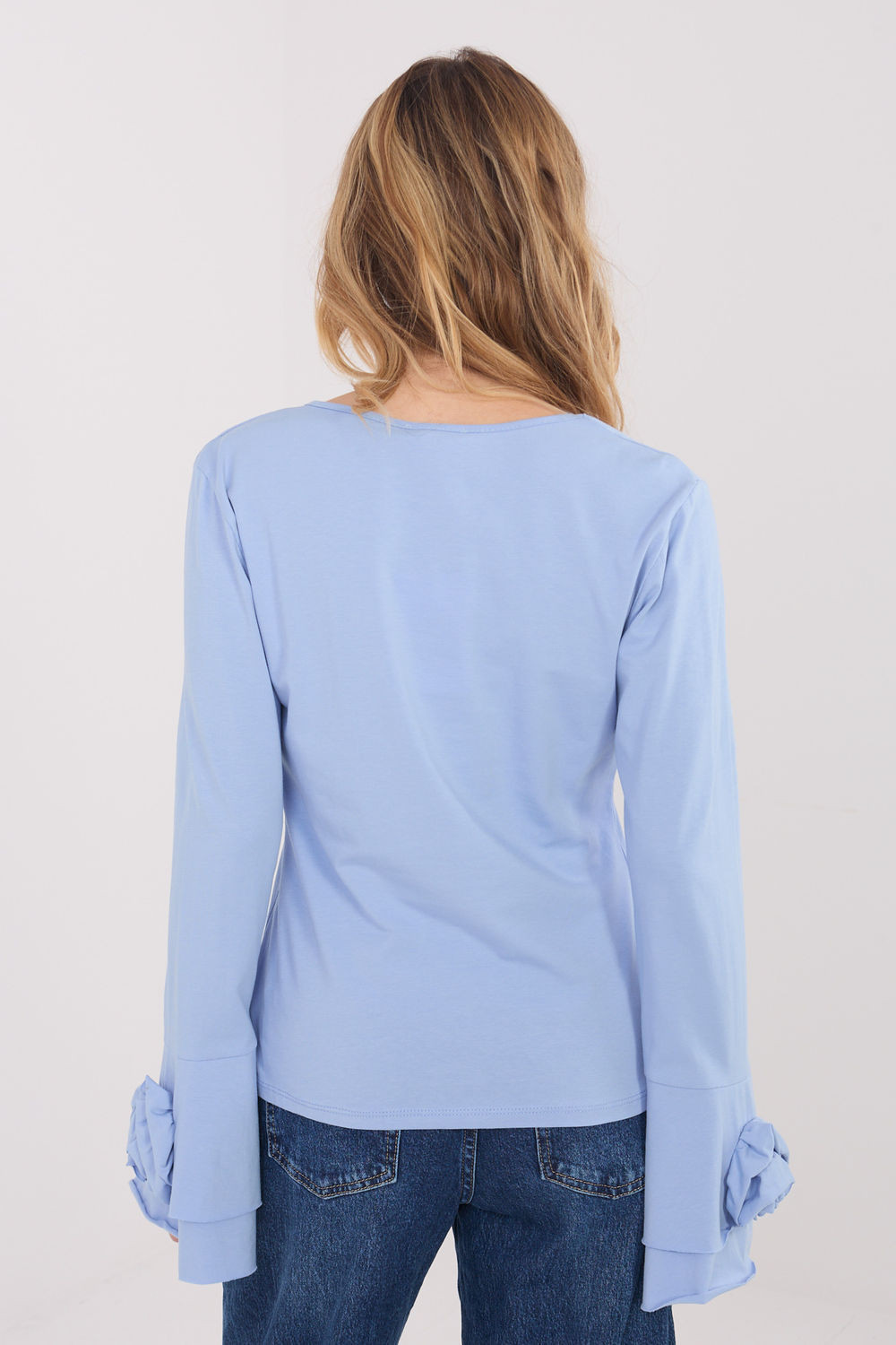 Elegantní blůza typu longsleeve s přizpůsobeným střihem, která efektně zdůrazňuje siluetu a kombinuje klasiku s ozdobnými detaily. Vyrobená z vysoce kvalitní bavlny, poskytuje komfort při nošení a příjemné přiléhání po celý den. Model s hladkým vzorem má výstřih do V, který decentně zdůrazňuje krk a přidává ženský charakter. Dlouhé zvonové rukávy dodávají lehkost a eleganci, a ozdobné materiálové květy umístěné na rukávech a u výstřihu představují výjimečný dekorativní prvek. Standardní délka zaručuje, že blůza skvěle padne jak do každodenních stylizací, do práce, na schůzky, tak i na elegantní výlety nebo večírky.