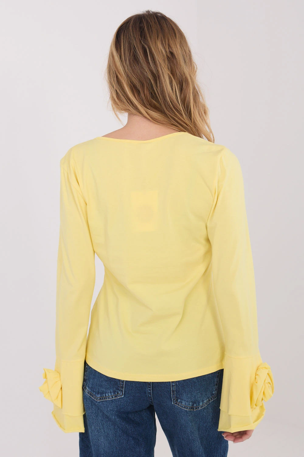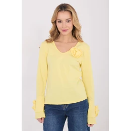 Elegantní blůza typu longsleeve s přiléhavým střihem, která efektně zdůrazňuje postavu a kombinuje klasiku s ozdobnými detaily. Vyrobená z vysoce kvalitní bavlny, poskytuje pohodlí při nošení a příjemné přizpůsobení po celý den. Model s hladkým vzorem má výstřih do V, který jemně zdůrazňuje krk a dodává ženský charakter. Dlouhé zvonové rukávy dodávají celku lehkost a eleganci, a ozdobné látkové květy umístěné na rukávech a kolem výstřihu představují výjimečný dekorativní prvek. Standardní délka zaručuje, že se blůza skvěle hodí jak do každodenních stylizací, do práce, na schůzky, tak i na elegantní večírky nebo akce.