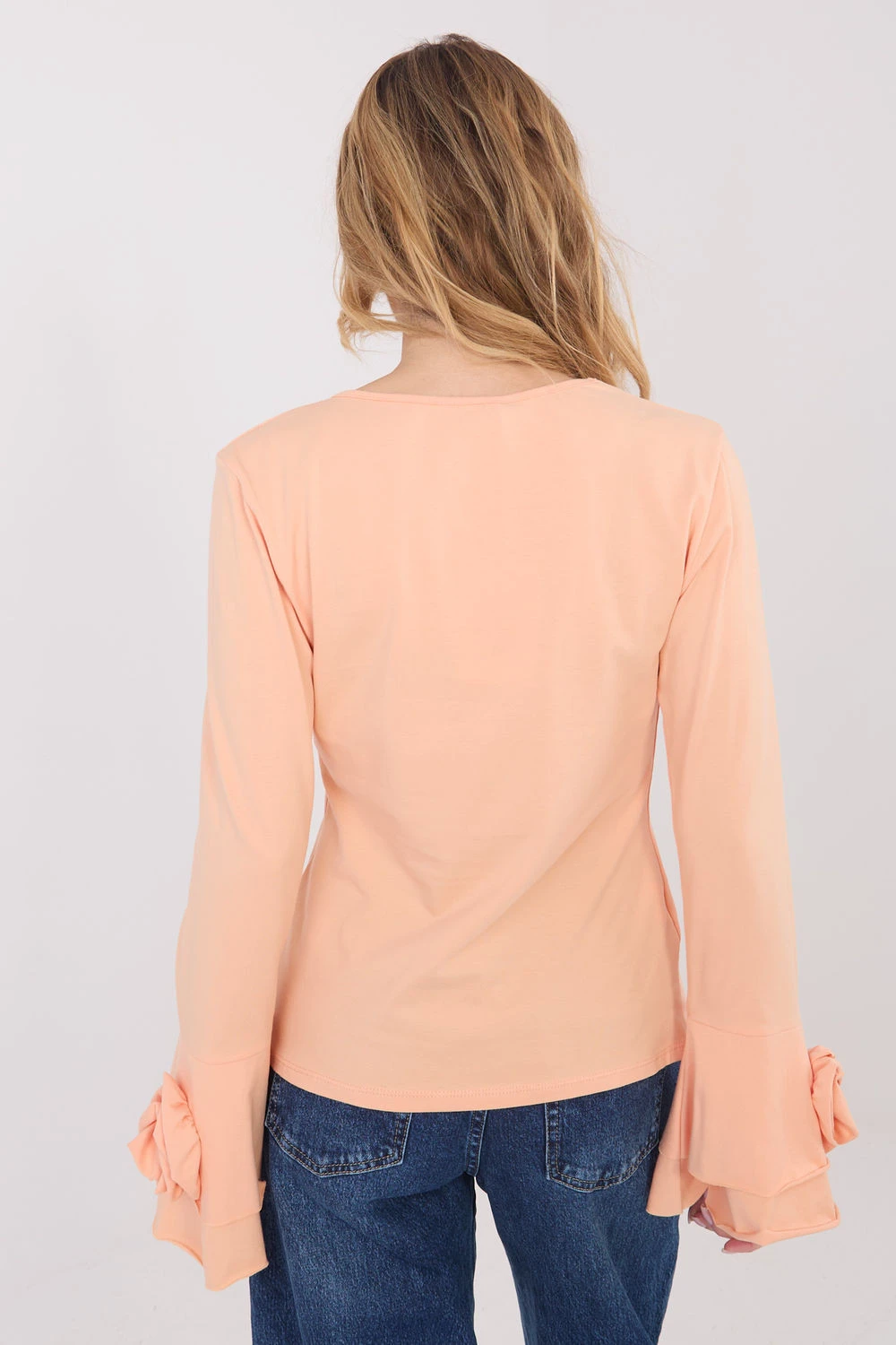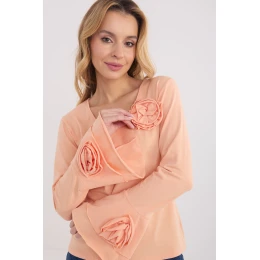 Elegantní blůza typu longsleeve s přiléhavým střihem, která efektně zdůrazňuje postavu a kombinuje klasiku s ozdobnými detaily. Vyrobená z vysoce kvalitní bavlny, poskytuje pohodlí a příjemné nošení po celý den. Model s hladkým vzorem má výstřih do V, který jemně zdůrazňuje krk a dodává ženský charakter. Dlouhé zvonové rukávy dodávají celku lehkost a eleganci, a ozdobné, látkové květy umístěné na rukávech a kolem výstřihu jsou výjimečným dekorativním prvkem. Standardní délka z ní činí vynikající volbu jak do každodenních stylizací, do práce, na setkání, tak i na elegantní výlety či večírky.