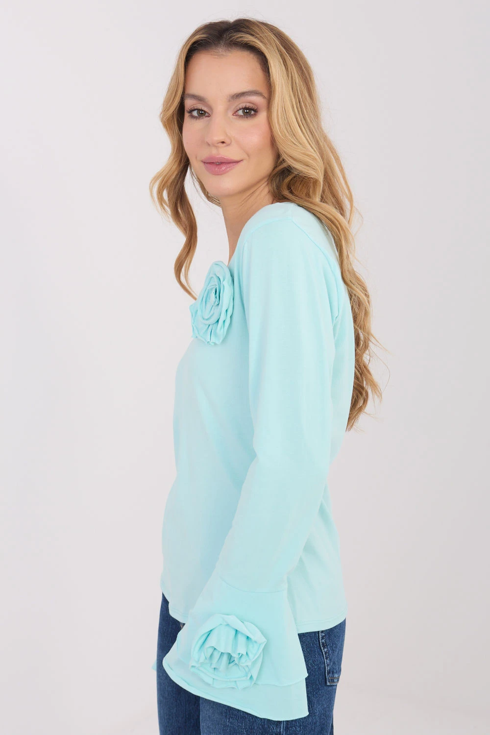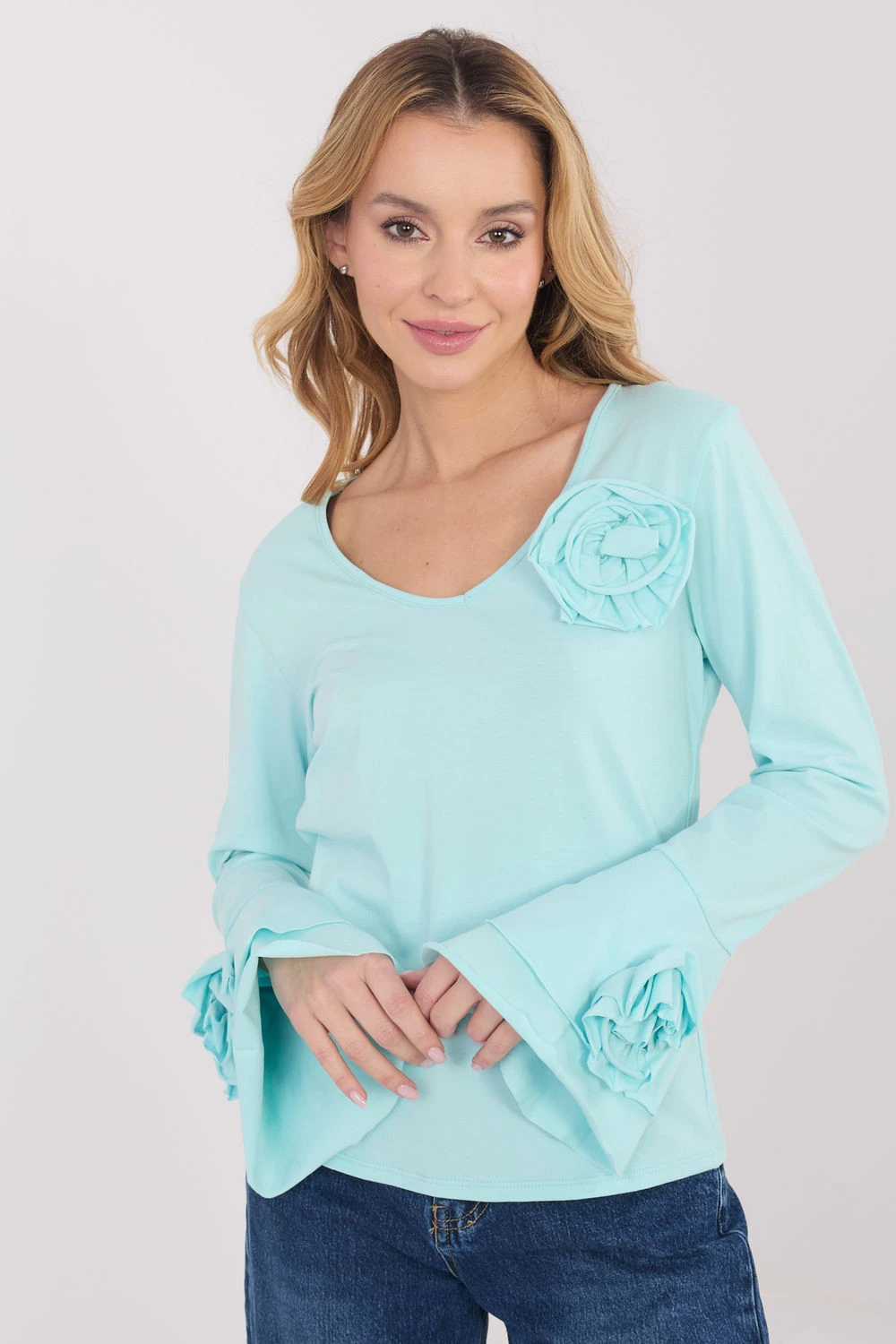 Elegantní blůza typu longsleeve s přiléhavým střihem, která efektně zdůrazňuje postavu a kombinuje klasiku s ozdobnými detaily. Vyrobená z vysoce kvalitní bavlny, poskytuje pohodlí a příjemné nošení po celý den. Model s hladkým vzorem má výstřih do V, který jemně zdůrazňuje krk a dodává ženský charakter. Dlouhé zvonové rukávy dodávají lehkost a eleganci, zatímco ozdobné látkové květy umístěné na rukávech a u výstřihu představují výjimečný dekorační prvek. Standardní délka zaručuje, že blůza se skvěle hodí jak do každodenních stylizací, do práce, na oficiální setkání, tak i na elegantní večírky nebo akce.