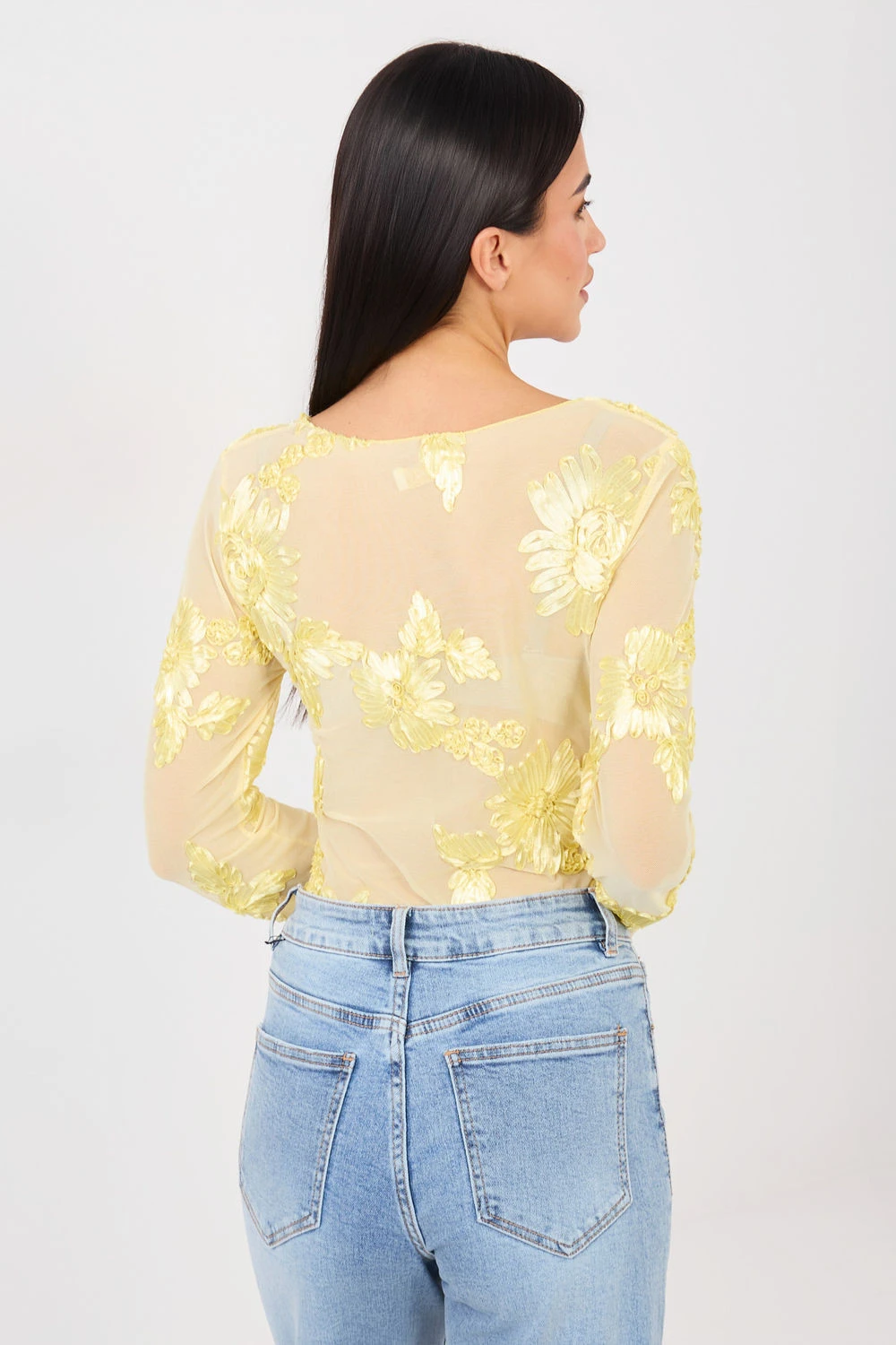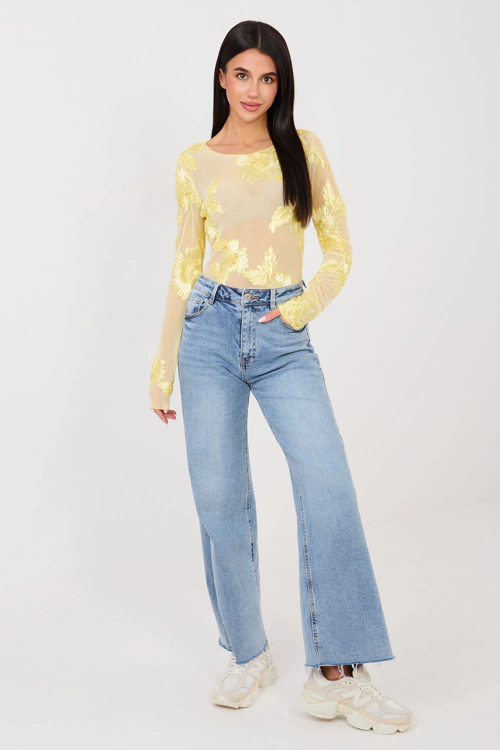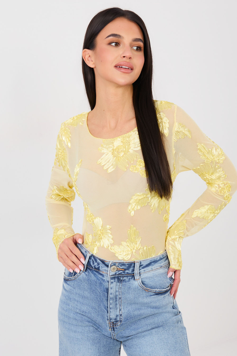 Elegantní, přiléhavá blůzka vyrobena z jemné síťoviny, která jemně zdůrazňuje siluetu. Model se vyznačuje efektním vzorem vyšívaných květů, který dodává celku výjimečný a ženský charakter. Blůzka se skvěle hodí na slavnostní události a večírky, představujíc stylový prvek večerních outfitů. Dlouhý rukáv a klasický, kulatý výstřih jí dodávají eleganci a nadčasový vzhled. Vyrobena z polyesteru s přídavkem elastanu, zaručuje pohodlí nošení, pružnost a dobré přizpůsobení. Standardní délka z ní činí skvělý doplněk jak k sukním, tak k elegantním kalhotám.