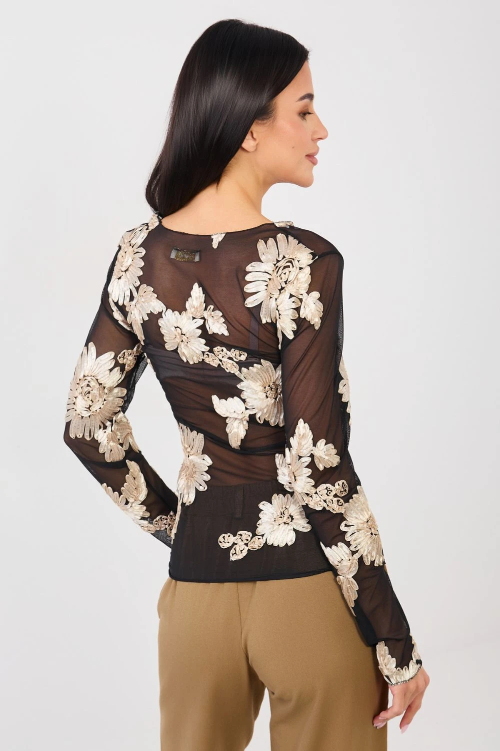 Elegantní, přizpůsobená blůza vyrobená z jemné síťoviny, která jemně zdůrazňuje postavu. Model se vyznačuje efektním vzorem vyšívaných květů, který dodává celku výjimečný a ženský charakter. Blůza se skvěle hodí na společenské události a party, představující stylový prvek večerních outfitů. Dlouhý rukáv a klasický, kulatý výstřih dodávají eleganci a nadčasový vzhled. Vyrobená z polyesteru s přídavkem elastanu, poskytuje pohodlí nošení, pružnost a dobré přizpůsobení. Standardní délka zajišťuje, že blůza skvěle ladí jak se sukněmi, tak s elegantními kalhotami.