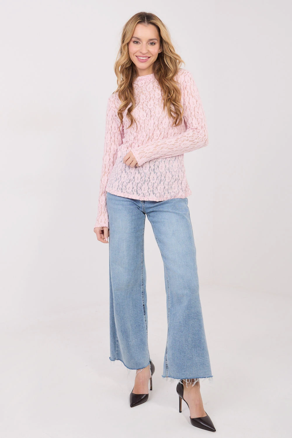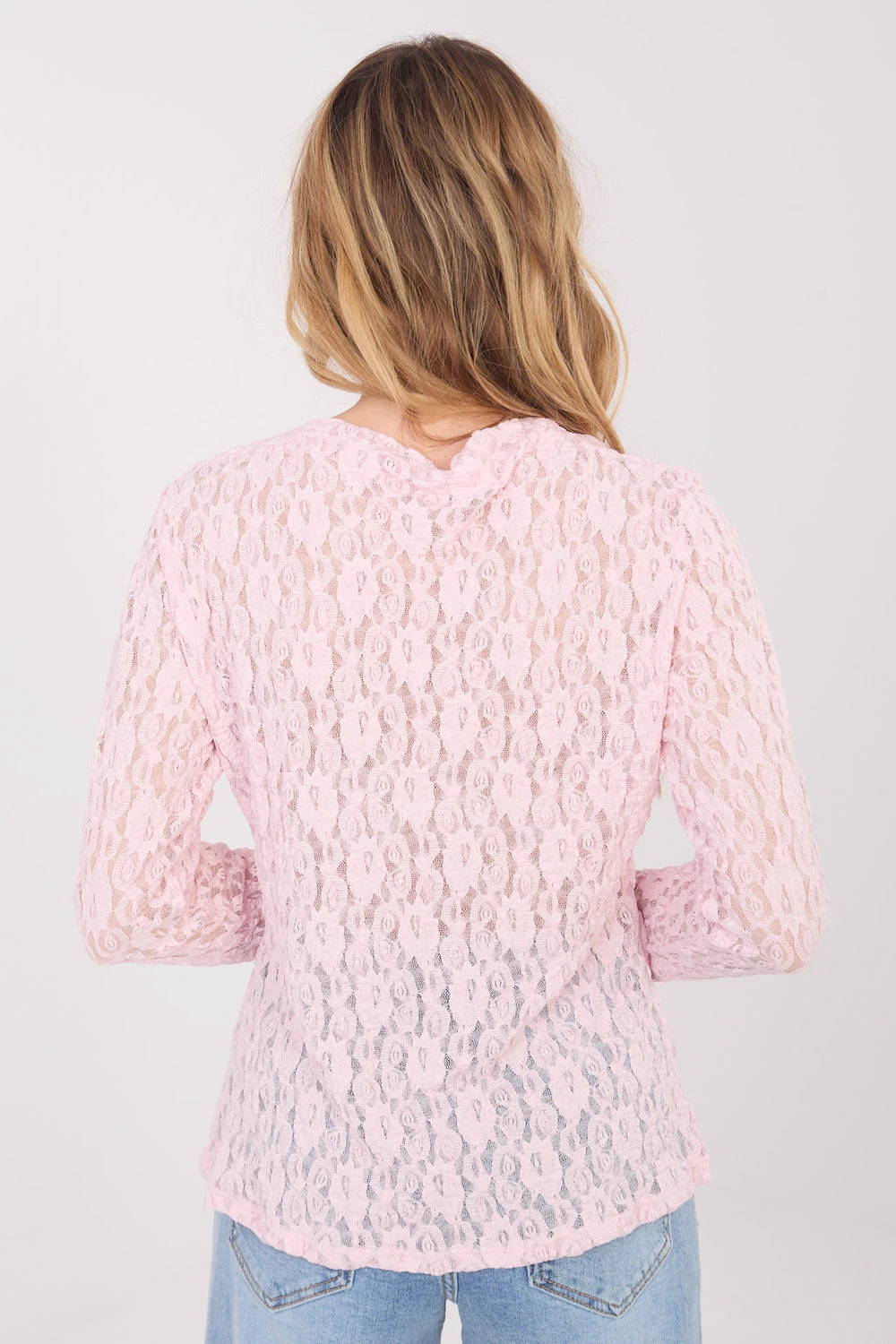 Elegantní krajková dámská blůza je stylovým návrhem, který se skvěle hodí do práce, stejně jako na příležitostné a společenské události. Jemný design a klasický tvar dělají z blůzy univerzální prvek ženského šatníku. Model standardní délky je vyroben z vysoké kvality směsi viskózy a elastanu, co zaručuje pohodlí nošení, elasticitu a ideální přizpůsobení postavě. Různorodá struktura materiálu zdůrazňuje elegantní charakter blůzy a dodává jí jedinečný vzhled. Blůza má dlouhé rukávy a stylový dekolt typu "loďka", který jemně zdůrazňuje linii ramen a krku. Model bez zapínání, nasazovaný přes hlavu, zaručuje pohodlí a estetické provedení. Je to ideální volba pro ženy, které si cení elegance, ženskosti a nadčasového stylu v každé situaci.