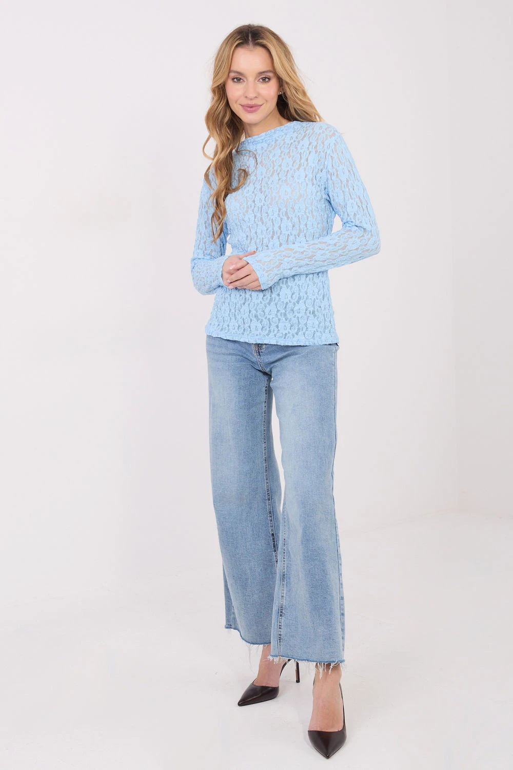 Elegantní krajková dámská blůza je stylovým návrhem, který se skvěle hodí do práce, stejně jako na slavnostní události a večírky. Jemný design a klasický střih dělají z blůzy univerzální kousek ženského šatníku. Model standardní délky je vyroben z vysoké kvality viskózy a elastanu, co zajišťuje pohodlí nošení, pružnost a ideální přizpůsobení postavě. Rozmanitá textura materiálu zdůrazňuje elegantní charakter blůzy a dodává jí jedinečný vzhled. Blůza má dlouhé rukávy a stylový "loďkový" výstřih, který jemně zdůrazňuje ramena a krk. Model bez zapínání, který se obléká přes hlavu, zaručuje pohodlí a estetické provedení. Je to ideální volba pro ženy, které oceňují eleganci, ženskost a nadčasový styl v každé situaci.