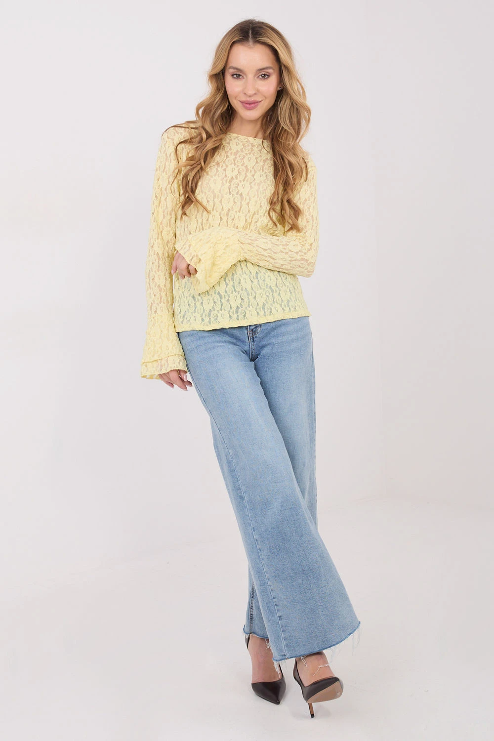 Elegantní, přizpůsobená krajková blůza je výjimečný model, který se skvěle hodí na návštěvy, večírky a do stylových pracovních outfitů. Vyrobená z vysoké kvality viskózy s přídavkem elastanu okouzluje měkkostí, pružností a pohodlím nošení. Rozmanitá textura materiálu dodává celku jemnou rafinovanou eleganci. Blůza má standardní délku a dlouhý zvonový rukáv, který se efektně rozšiřuje směrem dolů, vytvářející jemný ženský akcent. Navíc jsou rukávy zdobeny volánky, zdůrazňující elegantní, lehce romantický charakter modelu. Dekolt typu lodního výstřihu krásně zdůrazňuje linii krku a ramen, přidávající outfitu lehkost a eleganci. Jedná se o návrh, který spojuje eleganci, ženskost a pohodlí. Ideální na výjimečné události, rodinné oslavy, do práce nebo na večerní setkání, kdekoliv, kde chcete vypadat elegantně a s elegancí.