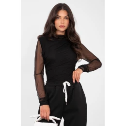 Elegantní, přizpůsobená dámská blůzka je výjimečným návrhem pro ženy, které ocení styl a všestrannost. Skvěle se hodí na slavnostní příležitosti, do práce, na večírek, stejně jako do každodenních elegantnějších stylizací. Hladký vzor zdůrazňuje její nadčasový charakter a umožňuje snadné kombinování s ostatními kousky šatníku. Blůzka je vyrobena z vysoce kvalitního polyesteru s přídavkem elastanu, co zajišťuje elasticitu, pohodlí nošení a dobře padnoucí střih. Krátká délka jemně zdůrazňuje proporce a průhledný, kulatý výstřih dodává celku jemnost a ženskou eleganci. Model má dlouhé rukávy z síťoviny bez podšívky, které dodávají lehkost a efektní vzhled. V prostřední části je blůzka vybavena podšitím, které zajišťuje pohodlí a dostatečné krytí. Další výhodou je drapování, které krásně tvaruje siluetu a zdůrazňuje elegantní charakter blůzky. Bez zapínání je model pohodlný a snadný na nasazení. Jedná se o stylovou a ženskou blůzku, ideální k nošení s kalhotami s vysokým pasem, sukněmi a elegantními saka.