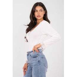 Přizpůsobený každodenní top je ideální volbou pro ženy, které si cení pohodlí spojené s decentní elegancí. Model v casual stylu se skvěle hodí jak na každý den, tak i do práce, vytvářejíc estetické a ženské outfit. Hladký vzor a proužkovaná struktura materiálu dodávají topu moderní a zároveň univerzální charakter. Top byl vyroben z elastické a příjemné směsi polyesteru a elastanu, co zajišťuje pohodlí a dobře padnoucí střih. Standardní délka zajišťuje, že se model skvěle kombinuje se šaty a sukněmi různých střihů. Stylovým akcentem jsou dlouhé rukávy zakončené jemnou krajku a dekolt v srdcovém výstřihu s obšitou krajkou, které dodávají celku ženský šarm a lehkost. Absence zapínání zdůrazňuje jednoduchost střihu a pohodlí nošení. Jedná se o top, který spojuje každodenní pohodlí s elegantními detaily, ideální pro mnoho outfitů.