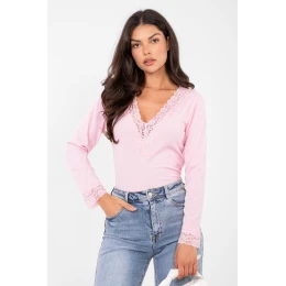 Přizpůsobený každodenní top je ideální volbou pro ženy, které ocení pohodlí spojené s jemnou elegancí. Model v casual stylu se skvěle hodí jak na každý den, tak do práce, vytvářejíc estetické a ženské outfit. Hladký vzor a proužkovaná struktura materiálu dodávají topu moderní a zároveň univerzální charakter. Top je vyroben z pružné a příjemné směsi polyesteru a elastanu, co zajišťuje pohodlí a dobře padnoucí střih. Standardní délka zaručuje, že se model skvěle kombinuje s kalhotami a sukněmi různých střihů. Stylovým doplňkem jsou dlouhé rukávy zakončené jemnou krajkou a dekolt v srdíčkovém výstřihu lemovaný krajka, které celku dodávají ženské kouzlo a lehkost. Absence zapínání zdůrazňuje jednoduchost střihu a pohodlí nošení. Toto je top, který spojuje každodenní pohodlí s elegantními detaily, ideální pro mnoho outfitů.