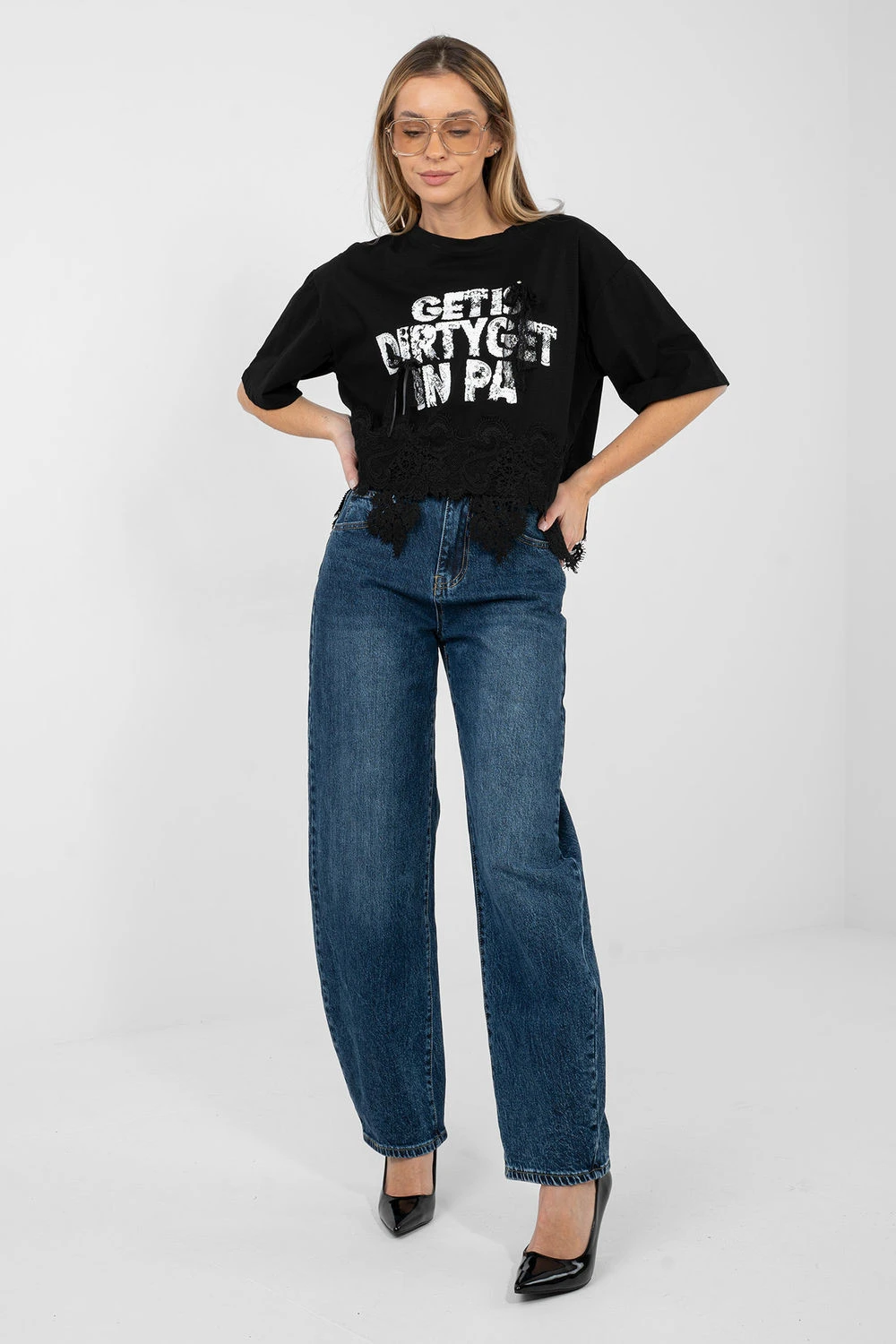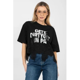 Každodenní dámský top s ženským a stylovým charakterem. Vyrobený z vysoké kvality bavlny s přídavkem elastanu, poskytuje pohodlí nošení, pružnost a skvělé přizpůsobení postavě. Model s krátkou délkou a krátkým rukávem se skvěle hodí na teplejší dny. Kulatý výstřih zdůrazňuje klasický střih a dodává topu univerzální vzhled. Ozdobné nápisy na přední straně, doplněné jemnou krajkou, přitahují pohled a dodávají celku módní akcent. Další výhodou je krajkový lem topu a decentní cirkonie, které mu dodávají ženský lesk. Ideální pro každodenní outfit s džínami, kraťasy nebo sukní.