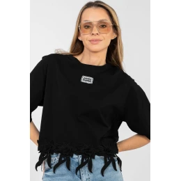 Každodenní dámský top v casual stylu, ideální pro pohodlné, nezávazné outfity. Vyrobený z vysoké kvality bavlny s přídavkem elastanu, poskytuje pohodlí, pružnost a skvělé přizpůsobení postavě. Model s krátkou délkou a krátkým rukávem se skvěle hodí na teplejší dny. Kulatý výstřih dodává topu klasický a univerzální charakter. Na přední straně je malá nášivka, která jemně oživuje jednoduchý střih. Další výhodou je vyšívaný lem dole na topu, který přidává celku jemný ženský akcent. Top skvěle ladí s džíny, kraťasy a sukněmi, vytvářející lehké, každodenní sestavy.
