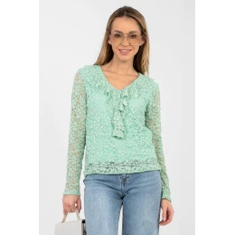 Elegantní krajkový top s elegantním charakterem, skvělý na návštěvy, do práce, na večírek a do každodenních stylových kombinací v elegantnějším provedení. Různorodá textura materiálu dodává celku výjimečný a decentní dekorativní vzhled. Top je vyroben z vysoce kvalitní viskózy s přídavkem elastanu, co zajišťuje pohodlí nošení a jemné přizpůsobení siluetě. Model má standardní délku, dlouhý rukáv a klasický, kulatý výstřih. Bez zapínání je top pohodlný a snadno se obléká. Na přední straně je podšívka, která zvyšuje pohodlí nošení a estetiku dokončení, a ozdobný žabot dodává celku eleganci a ženský charakter. Je to ideální volba k látkovým kalhotám, sukní nebo pod sako, jak na formální setkání, tak na speciální příležitosti.