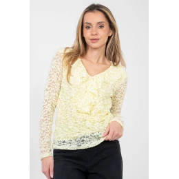 Elegantní krajková blůza s elegantním charakterem, skvělá na návštěvy, do práce, na večírek a do každodenního stylu v luxusnějším provedení. Různorodá textura materiálu dodává celku výjimečný a jemně dekorativní vzhled. Blůza je vyrobena z vysoce kvalitní viskózy s přídavkem elastanu, co zaručuje pohodlí nošení a jemné přizpůsobení se postavě. Standardní délka, dlouhý rukáv a klasický kulatý výstřih. Bez zapínání, což činí blůzu pohodlnou a snadnou na nasazování. Na přední straně je podšívka, která zvyšuje pohodlí nošení a estetiku dokončení, a ozdobný plisovaný límec dodává celku eleganci a ženský charakter. Ideální volba ke kalhotám z materiálu, sukní nebo pod sako, jak na formální schůzky, tak na zvláštní příležitosti.