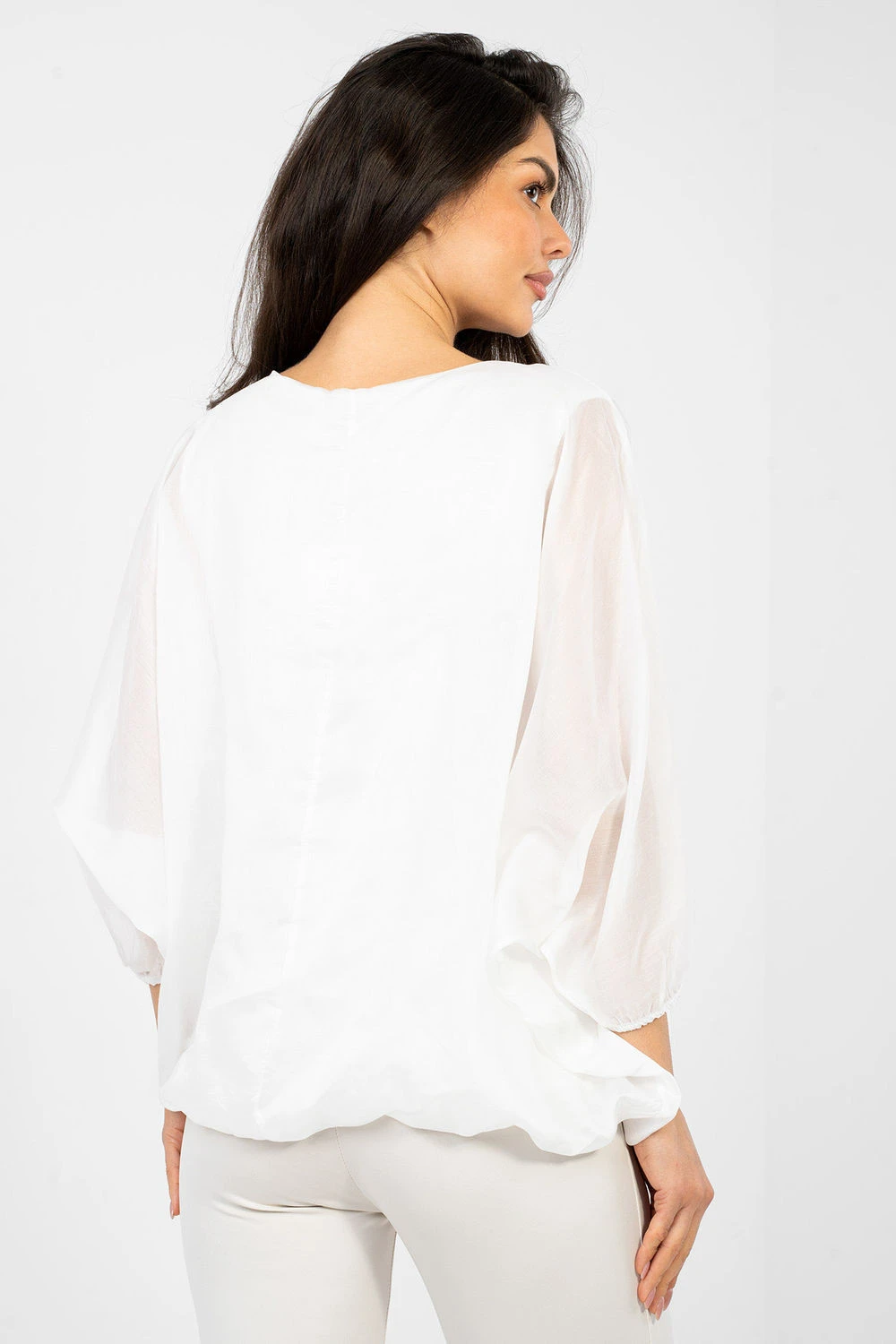 Elegantní blůzka standardní délky, ideální do práce a na formální události, kombinující stylový vzhled s pohodlím nošení. Model vyrobený z kombinace tencelu a polyesteru poskytuje příjemnou měkkost a trvanlivost materiálu. Blůzka má klasický, kulatý výstřih a 3/4 rukávy, hladký vzor jí dodává univerzální charakter. Další výhodou je podšívka v centrální části, která jemně modeluje postavu a zajistí elegantní uspořádání pod oblečením. Ideální jak do kancelářských outfitů, tak i na formální výstupy.