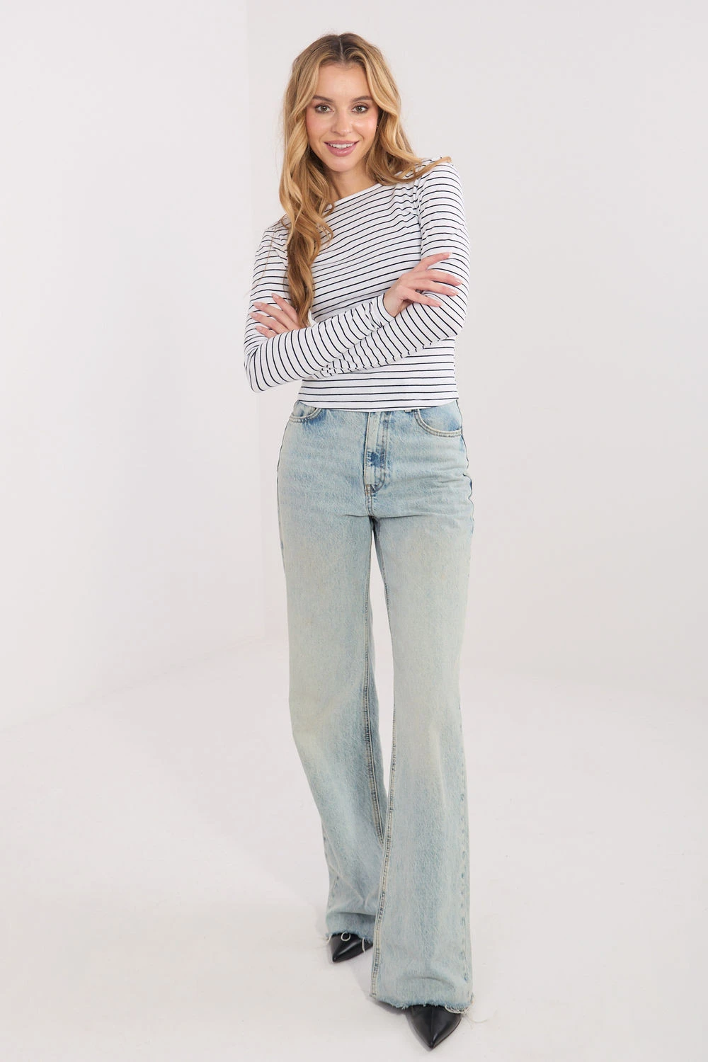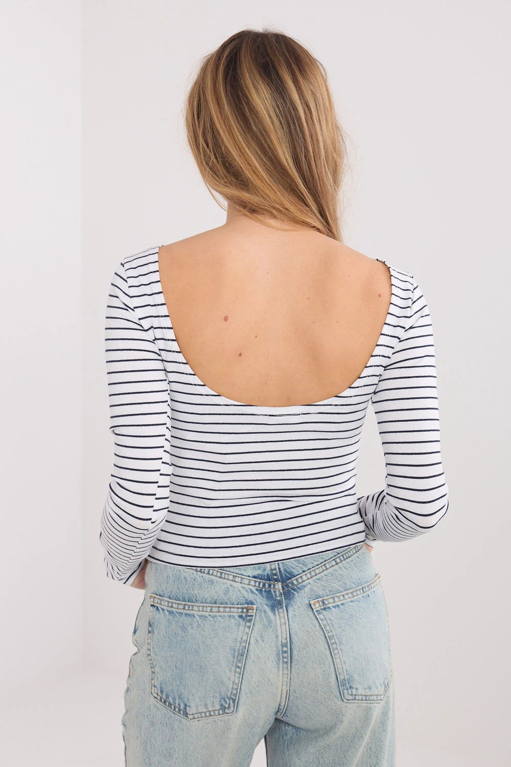 Přizpůsobený dámský dlouhý rukáv je stylovým návrhem v casualovém provedení, ideální na každý den. Krátký střih krásně zdůrazňuje postavu a elastický materiál se přizpůsobuje tělu, poskytující pohodlí a volnost pohybu. Model vyrobený z kombinace bavlny a elastanu je příjemný na dotek, prodyšný a lehce pružný. Pruhovaný vzor dodává celku nadčasový charakter a dělá z blůzky skvělý doplněk do každodenních stylizací. Výstřih typu člun jemně zdůrazňuje ramena, zatímco hluboký výstřih na zádech přidává smyslný akcent a odlišuje model od klasických střihů. Dlouhý rukáv a absence zapínání zdůrazňují minimalistický, moderní design. Je to skvělá volba k džínům, šortkám nebo sukni s vysokým pasem, ideální základ pro moderní, uvolněné stylizace.