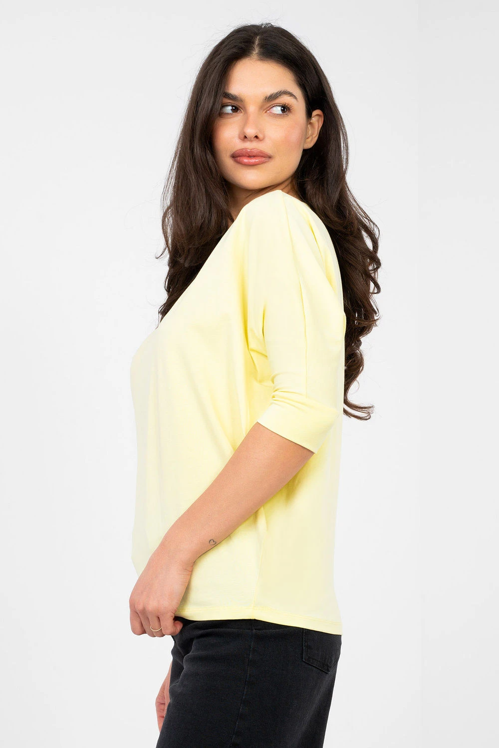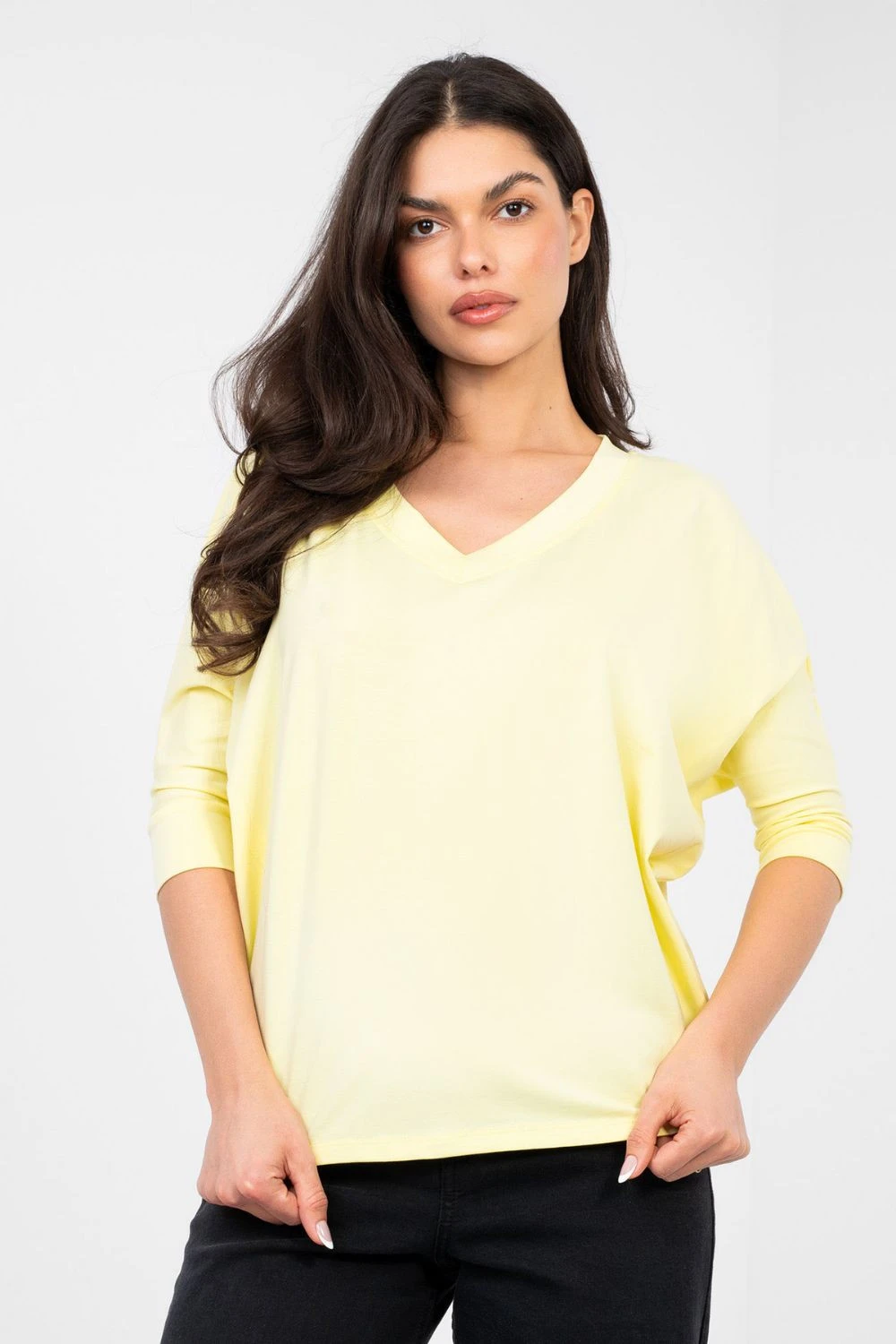 Univerzální každodenní blůza s nadčasovým, hladkým vzorem, která skvěle doplní každou garderobu. Vyrobena z vysoce kvalitní bavlny s přídavkem elastanu, je měkká, prodyšná a příjemná k pokožce, zároveň jemně elastická, díky čemuž poskytuje volnost pohybu a pohodlí po celý den. Model s klasickou délkou a 3/4 rukávem je praktickým řešením pro každé roční období. Klasický výstřih do V decentně zdůrazňuje krk a dodává celku ženský charakter. Bez zapínání je blůza pohodlná na oblékání a má minimalistický, estetický vzhled.
