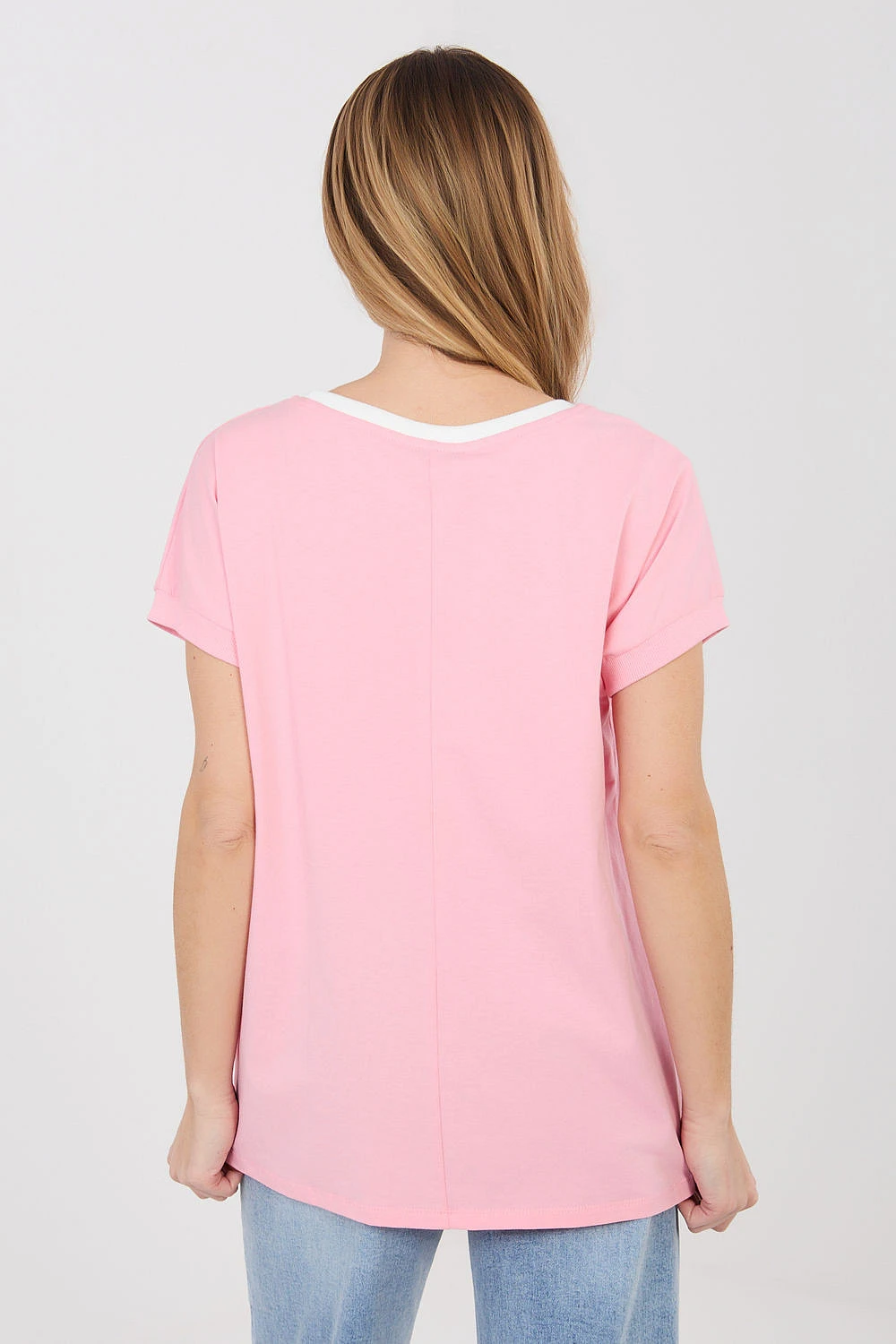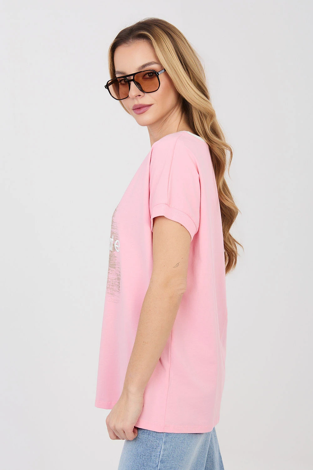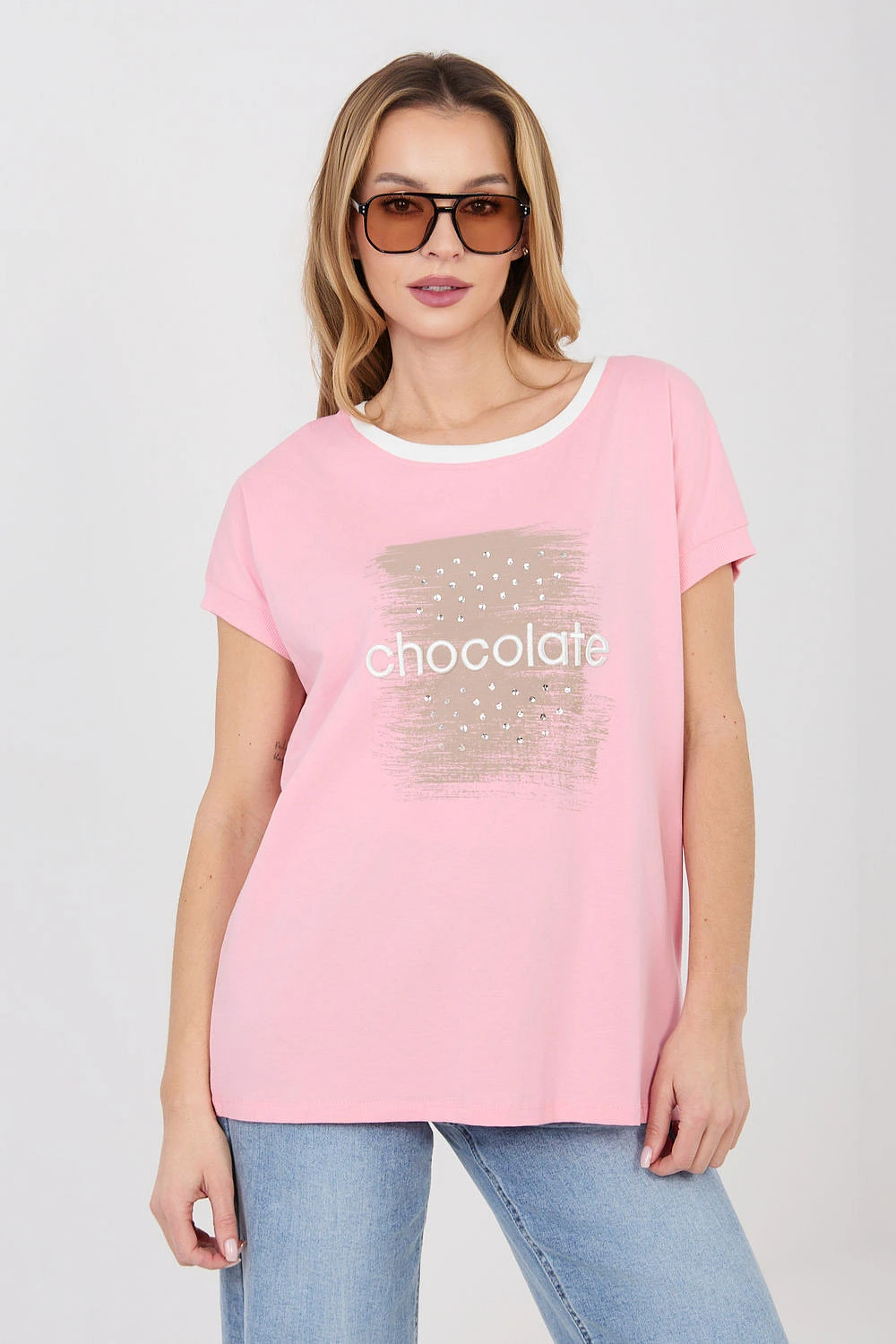 Elegantní a pohodlný každodenní top v casualovém provedení, ideální na každý den. Model má klasický, kulatý výstřih s kontrastní lemovkou, která dodává jemný charakter a zdůrazňuje detaily oblečení. Top je zdobený vyšívaným nápisem s flitry na přední straně, což je efektní akcent a dominující vzor celého modelu. Krátký rukáv a standardní délka zajišťují pohodlí při nošení, a volný, každodenní střih zapadá do casualového stylu. Vyrobený z vysoce kvalitní bavlny s přídavkem elastanu, díky čemuž je měkký, příjemný na dotek a lehce pružný, poskytující pohodlí po celý den. Model nemá zapínání, což zdůrazňuje jednoduchost a funkcionalitu designu.