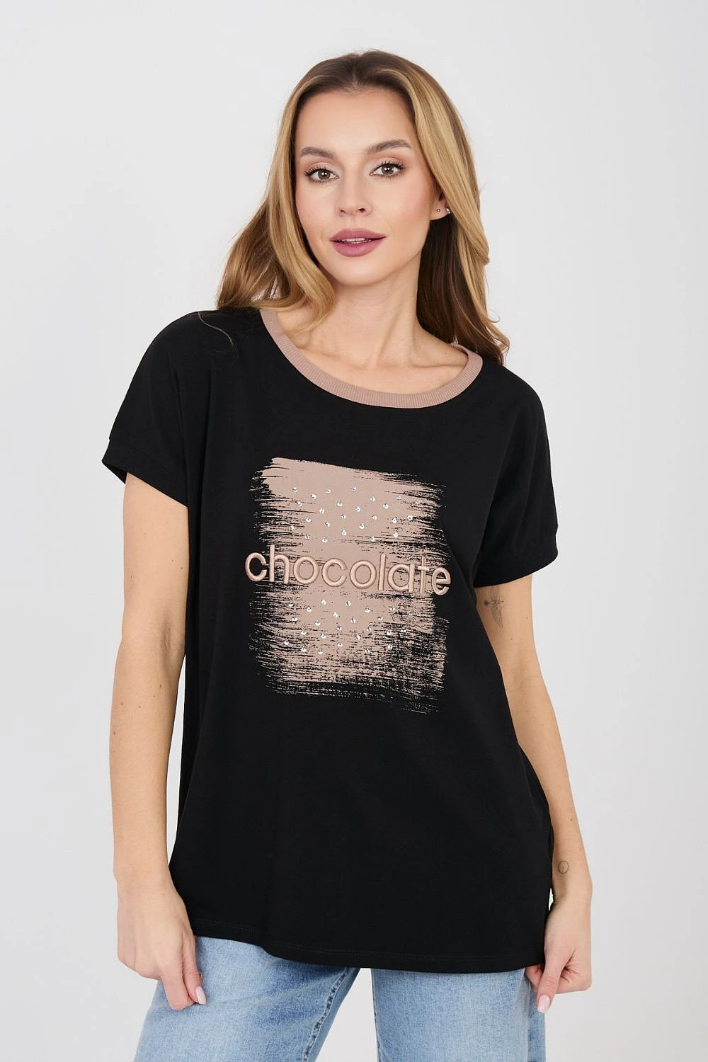 Elegantní a pohodlný každodenní top v casual stylu, ideální na každý den. Model má klasický kulatý výstřih s kontrastním lemikem, který dodává jemný charakter a zdůrazňuje detaily oblečení. Top je zdoben vyšívaným nápisem s flitry na přední straně, což je efektní akcent a dominující vzor celého modelu. Krátký rukáv a standardní délka zajišťují pohodlí při nošení a volný, každodenní střih zapadá do casual stylu. Vyroben z vysoce kvalitního materiálu bavlny s přídavkem elastanu, díky čemuž je měkký, příjemný na dotek a lehce pružný, což zajišťuje pohodlí po celý den. Model nemá žádné zapínání, což zdůrazňuje jednoduchost a funkčnost designu.
