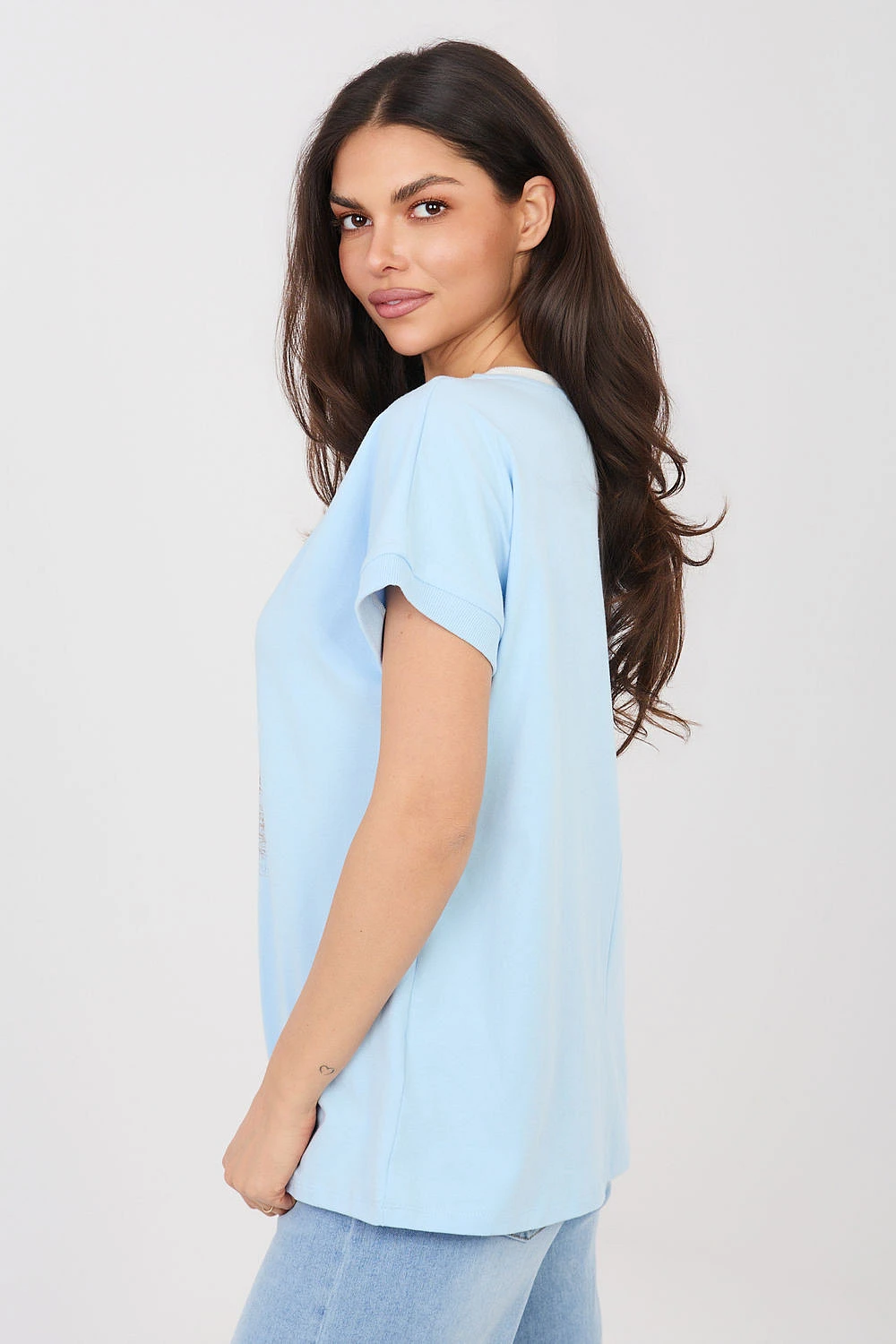 Elegantní a pohodlný každodenní top v casual stylu, ideální na každý den. Model má klasický, kulatý výstřih s kontrastním lemikem, který dodává jemný charakter a zdůrazňuje detaily oblečení. Top je zdoben vyšívaným nápisem s flitry na přední straně, což je efektní akcent a dominující vzor celého modelu. Krátký rukáv a standardní délka zajišťují pohodlí při nošení, a volný, každodenní střih zapadá do casual stylu. Vyrobena z materiálu vysoce kvalitní bavlny s přídavkem elastanu, díky čemuž je měkká, příjemná na dotek a lehce pružná, poskytující pohodlí po celý den. Model nemá žádné zapínání, což zdůrazňuje jednoduchost a funkčnost designu.