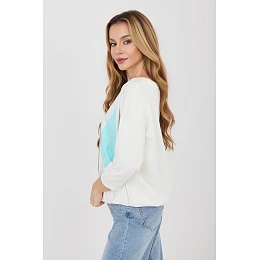 Pohodlná dámská halenka v každodenním stylu, ideální pro ležérní outfit. Model standardní délky má klasický kulatý výstřih a praktický 3/4 rukáv, který zajišťuje pohodlí a hodí se na každé roční období. Na přední straně je geometrický vzor, který je dominantním dekoračním prvkem a dodává halence moderní charakter. Jednoduchý střih zajišťuje, že se model dobře přizpůsobí postavě a snadno se kombinuje s různými outfity. Halenka je vyrobena z vysoce kvalitní bavlny s přídavkem elastanu, díky čemuž je materiál měkký, příjemný na dotek a lehce pružný. Model nemá zapínání, co zdůrazňuje jeho pohodlný každodenní charakter.