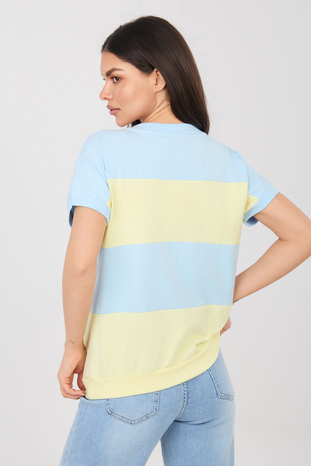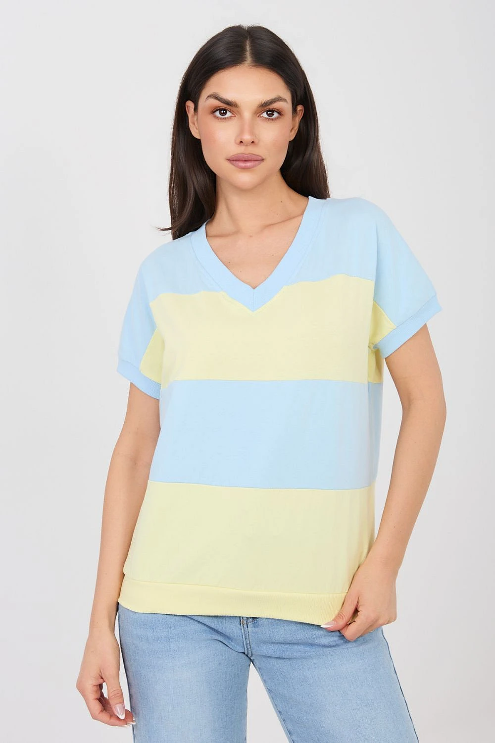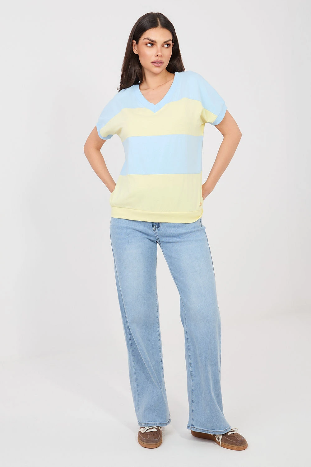 Elegantní dámský top v casual provedení, ideální na každý den. Model standardní délky má krátký rukáv a ženský výstřih do V, který jemně zdůrazňuje linii krku a dodává lehkost celému outfitu. Dominantním prvkem designu jsou široké pruhy, které dávají topu moderní a nadčasový charakter. Jednoduchý, pohodlný střih zajišťuje, že se model dobře přizpůsobí postavě a poskytuje volnost pohybu během každodenního nošení. Top je vyroben z vysoce kvalitní bavlny s přídavkem elastanu, díky čemuž je materiál měkký, příjemný k pokožce a lehce pružný. Model bez zapínání zdůrazňuje jeho pohodlný, každodenní charakter a skvěle se hodí do mnoha casual outfitů.
