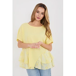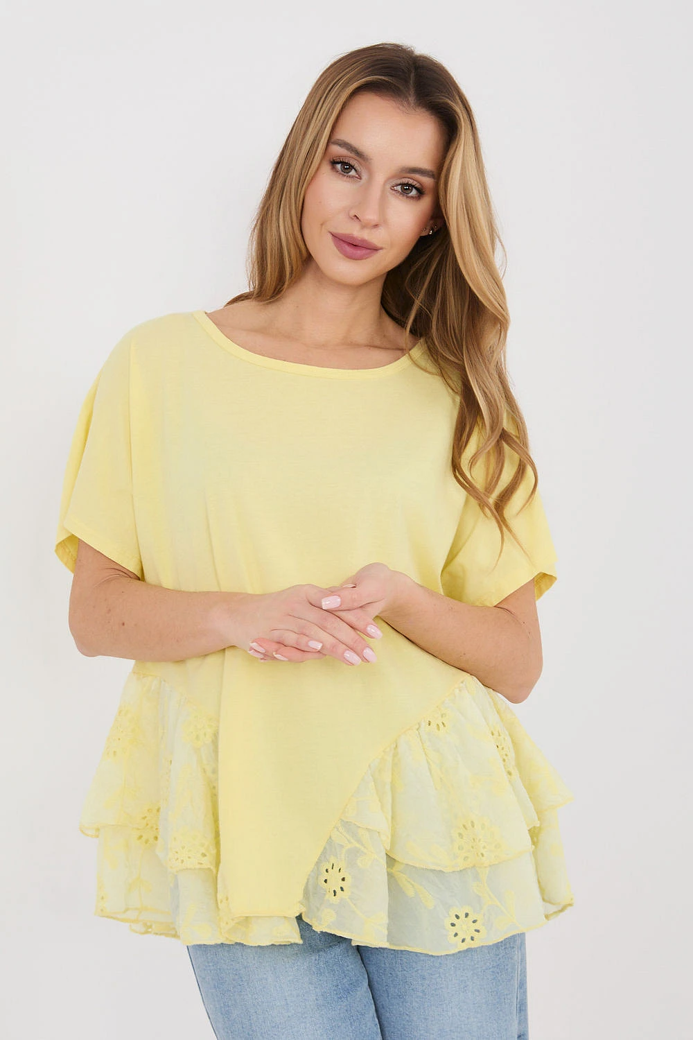 Halena vyrobená z vysoce kvalitní bavlny, která zaručuje pohodlí po celý den. Model s hladkým, minimalistickým vzorem, díky čemuž je snadno kombinovatelný s mnoha styly, jak casualovými, tak elegantními. Halena má klasický kulatý výstřih a krátký rukáv, co ji činí ideální pro teplé dny. Standardní délka se dobře hodí k postavě a umožňuje ji nosit jak s kalhotami, tak s sukněmi. Model nemá žádné zapínání, což z něj činí pohodlný a snadný k nasazení. Jako další ozdobný prvek je jemná vyšívaná volánka dole, která halenu dodává lehkost a ženský charakter.